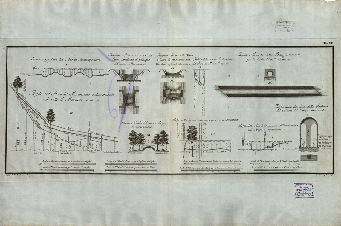 "SALVATORE PICCIOLI ING. DELINEO'. COSIMO ZOCCHI INCISE. Pianta della Val di Chiana eseguita in seguito alla perizia composta di Benedetto Passionei, Pio Fantoni matematico, Andrea Vici ingegnere e Domenico Sardi ingegnere, delegati dello Stato Pontificio e il Conte Federico da Montauto, Pietro Ferroni e GiuseppeSalvetti ingegnere, commissari del Gran Duca di Toscana. Incisione su rame. Scala grafica in canne fiorentine e in canne romane. Annesse n. 7 tavole delle stesse dimensioni con vari profili a scale varie disegnate da Capretti A. e da Giu. Bald. Puliti, incise da C. Colombini B. Eredi, Gio. Batta Cecchi e G. Vascellini."