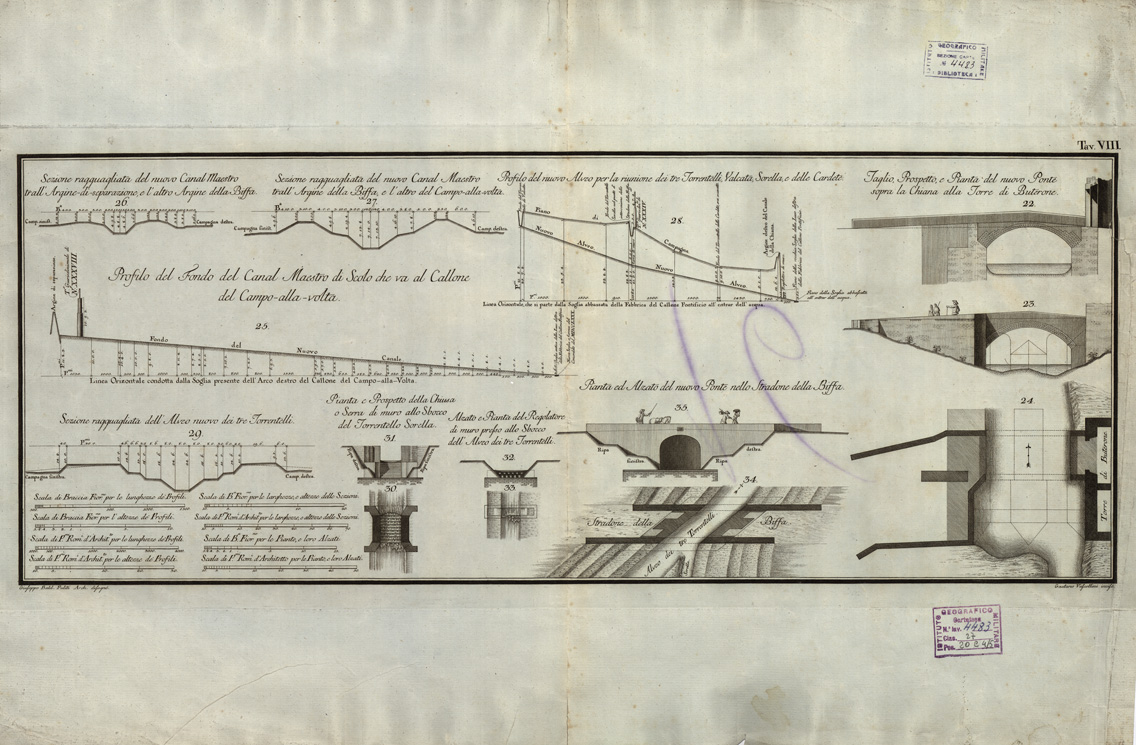 "SALVATORE PICCIOLI ING. DELINEO'. COSIMO ZOCCHI INCISE. Pianta della Val di Chiana eseguita in seguito alla perizia composta di Benedetto Passionei, Pio Fantoni matematico, Andrea Vici ingegnere e Domenico Sardi ingegnere, delegati dello Stato Pontificio e il Conte Federico da Montauto, Pietro Ferroni e GiuseppeSalvetti ingegnere, commissari del Gran Duca di Toscana. Incisione su rame. Scala grafica in canne fiorentine e in canne romane. Annesse n. 7 tavole delle stesse dimensioni con vari profili a scale varie disegnate da Capretti A. e da Giu. Bald. Puliti, incise da C. Colombini B. Eredi, Gio. Batta Cecchi e G. Vascellini."