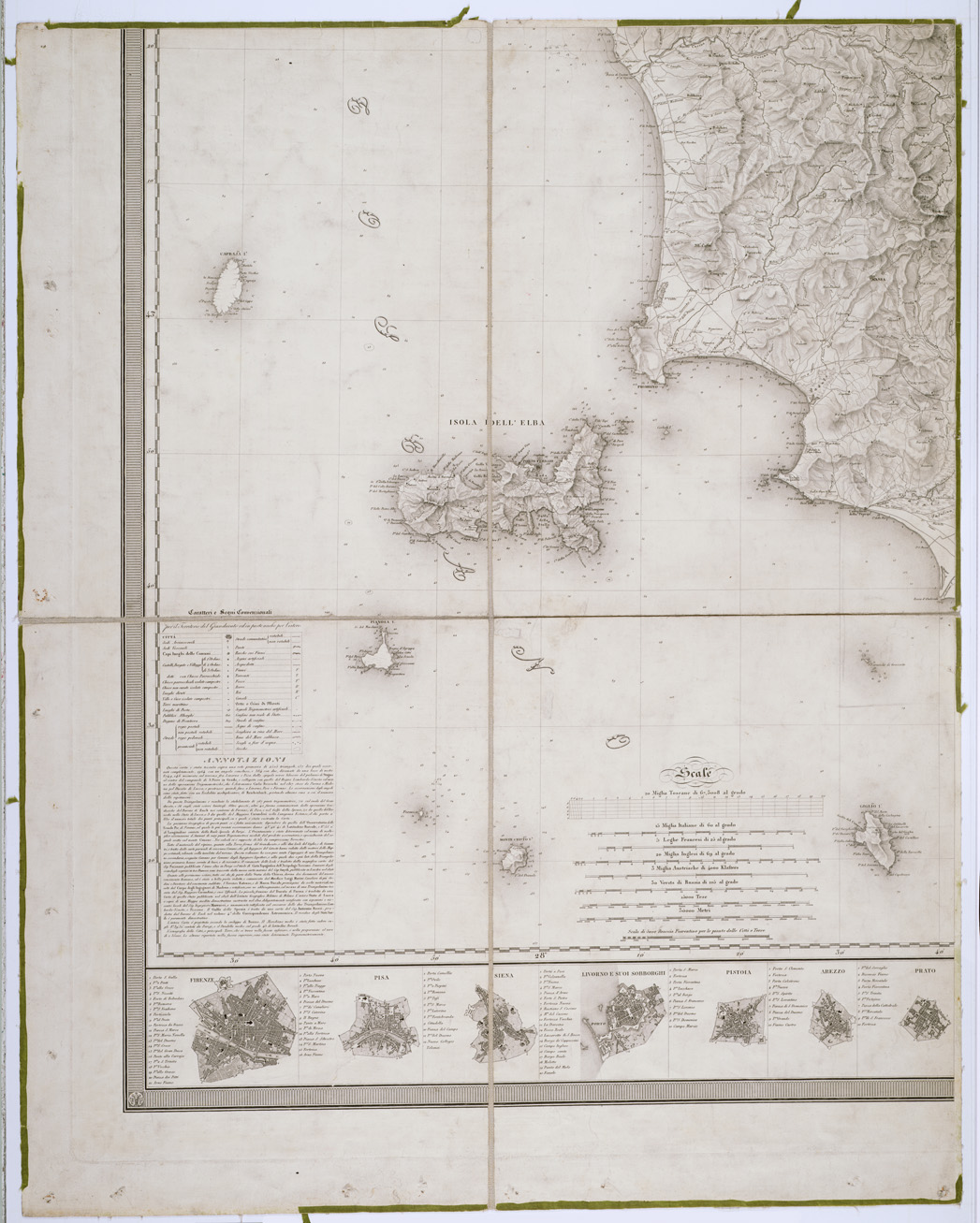 "DEDICATA A S. A. I. E R. LEOPOLDO II PRINCIPE IMPER.LE D'AUSTRIA, ECC., ECC., DAL SUO OSSEQUIOSISSIMO SERVO, ECC., ECC., GIOVANNI INGHIRAMI DELLE SCUOLE PIE. FIRENZE. Quattro fogli incisi su rame, montati su tela a stacchi, stampati in nero. Carta basata su regolare triangolazione e su le mappe catastali eseguite dal 1817 al 1827 a scale variabili da 1:5 000 a 1:625. Proiezione di Bonne. Meridiano medio calcolato a 8° 39' 30'' da Parigi parallelo medio 43° di latitudine Boreale. Longitudini calcolate dal meridiano dell'Isola del Ferro. Orografia rappresentata col tratteggio a luce obliqua. Cfr. MORI A., La Cartografia Ufficiale dell'Italia e l'I.G.M., pagg. 62-63. La nascita di questa importante carta iniziò con l'esecuzione delle prime misure finalizzate al collegamento geodetico delle città di Prato e Pistoia alla piccola rete trigonometrica locale fiorentina, condotte dal padre scolopio Giovanni Inghirami. In circa dieci anni tutte le carte catastali a scale comprese tra 1:5.000 ed 1:625 vennero ridotte alla scala 1:200.000 ed adattate alla corografia toscana con l'assistenza del padre Numa Pompilio Tanzini. Il disegno dei territori insulari fu derivato dalla carta del Puissant, mentre le quote batimetriche lungo la costa tirrenica ed in prossimità delle isole vennero dedotte dai rilevamenti idrografici effettuati dall'ufficiale inglese William Henry Smith (1788-1865), e la planimetria degli stati confinanti venne derivata da vari documenti cartografici disponibili. La carta della Toscana venne ultimata nel 1830 nella proiezione di Bonne, con incisione affidata alle cure di Giocondo Ragazzoni e di Stanislao Stucchi, in quattro fogli, contenenti, oltre alla corografia vera e propria, un ricco apparato fuori margine, con le piante dei principali centri abitati della Toscana delineati alla scala di 1:35.000, una tabella di 216 località con l'"Elevazione dei principali monti e luoghi più ragguardevoli del Granducato sopra il livello del mare in piedi francesi", un quadro dei "caratteri e segni convenzionali", divisi in città, sedi vescovili, comuni, castelli, chiese, luoghi diruti, poste, strade, ponti, fiumi, scogli secche, ecc. ed una descrizione generale dei criteri di formazione adottati (Barsanti D., 1992). Cfr. CANTILE A., Rappresentare e misurare il Mondo. I.G.M., 2004, pagg. 179-180. La stessa carta è nella Coll. Pasqui n. 15 e nella Cart. Arch. n. 68 doc. n. 3. Confronta anche " La Toscana divisa in comunità..." Coll. Pasqui n.16 e 16 bis. Da questa carta derivano anche le carte alle Collezioni Bianconi n.217 e Fossombroni n.4469 (1) dal titolo " Carta Geometrica della Toscana "."
