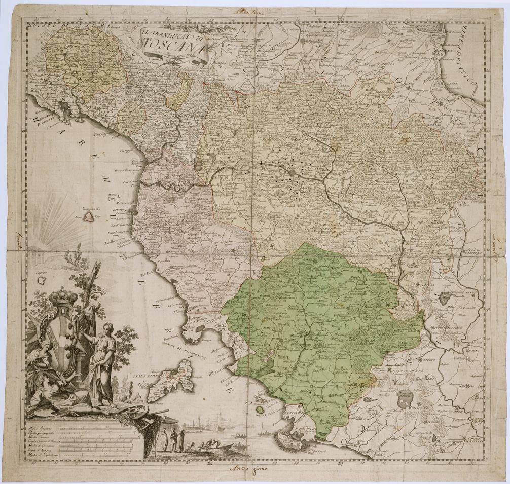 "Incisione su rame e stampa in bianco e nero con acquerello su carta telata. Orientazione normale. Longitudine derivate dal meridiano dell´Isola del Ferro. Orografia prospettica a monticelli. Abitati principali rappresentati schematicamente in pianta: gli altri con torri e case. Confini e territori statali a colori. Limiti: nord, Valli di Comacchio est, Perugia ovest, Mare Mediterraneo sud, Sutri. Sette scale grafiche in misure antiche italiane ed estere. La carta voleva avere non tanto una funzione geografica d'insieme ma una funzione prettamente tematica particolare, essendo esplicitamente dedicata ad un'utenza in quel tempo sempre più numerosa, come quella dei viaggiatori: ai quali offrire, cioè, informazioni il più possibile dettagliate e attendibili sulla rete principale e sulle stazioni di posta presenti lungo di quelle, all'interno di un contesto geopolitico rimasto assai variegato quale quello toscano. Cfr. Barsanti, Bonenni Conenna e Rombai, 2001, pag. 16. Cfr. ROMBAI L., Rappresentare e misurare il Mondo. I.G.M., 2004, pagg. 179-180. La stessa carta trovasi al n. 3142 dell'inv. gen. (file B0000145-146) (file B0012941-2) stampa su seta."