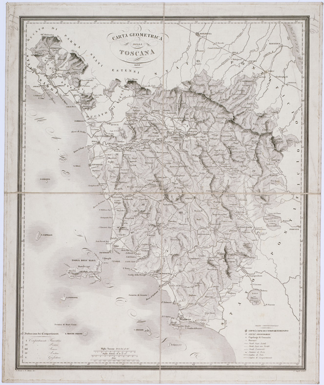 "Incisione su rame di G. Pozzi e G. Maina, su disegno di V. Angeli. E´ derivata dalla carta di G. Inghirami: Collez. Bianconi N° 215, Collez. Pasqui N°15, Cartella d'Archivio N° 69 Docum. N° 3. A sinistra in basso l´indicazione dei compartimenti. La copia, Fossombroni n. 4469 (1), è datata 1848. "