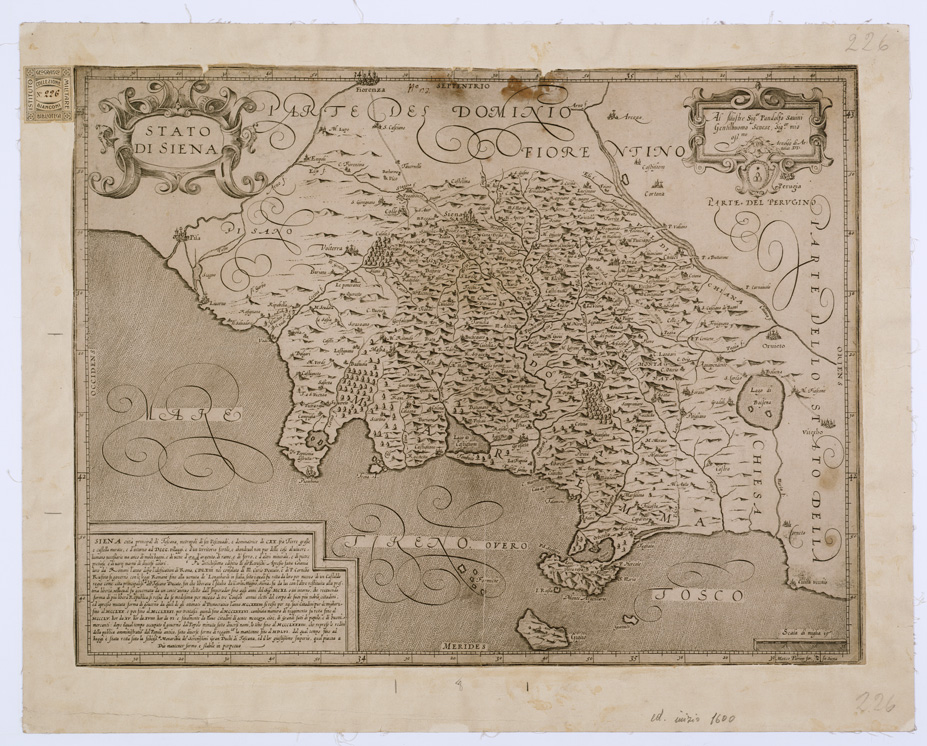 "Dedicata a Pandolfo Savini, gentiluomo senese, con firma di Arnoldo di Arnoldi. Incisione su rame su foglio unico. È derivazione della carta del Buonsignori (1584). In basso a sinistra una leggenda con notizie storiche di Siena. Orografia a monticelli. Abitati rappresentati schematicamente in prospettiva. Limiti: nord, Fiorenza sud, Isola del Giglio est, Perugia ovest, Pisa. Cfr. R. ALMAGIA', L'Italia di Giov. Ant. Magini, ecc., pag. 18 e ARRIGONI e BERTARELLI, Le carte geografiche dell'Italia, n. 2019. E' poi da notare che il Florimi introduce ne lo STATO DI SIENA un contenuto originale del tutto assente nei modelli cinquecenteschi, come la viabilità principale. Cfr. MORI, 1907 ROMBAI e CIAMPI, 1979, pagg. 52-71 LAGO, 2002, pag. 720 e ROMBAI, a cura, 1993, pagg. 94-100 e 104. Cfr. GUARDUCCI A., Rappresentare e misurare il Mondo. I.G.M., 2004, pag. 178."