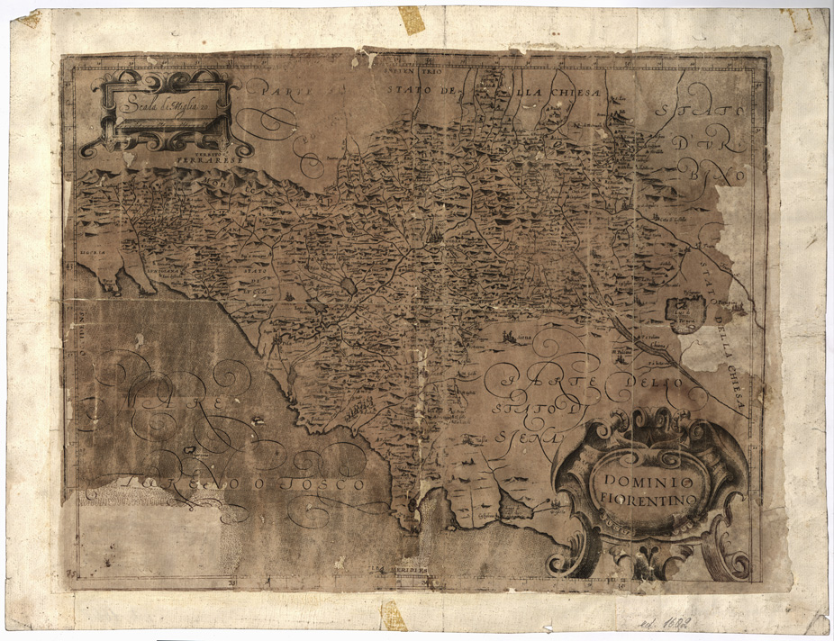 "Il "Dominio Fiorentino" rappresenta il frutto dell'aggiornamento e dell'adattamento prodotti, a cavallo tra Cinque e Seicento, dal grande geografo e cartografo padovano Giovanni Antonio Magini per il suo atlante italiano (edito postumo, solo nel 1620, dal figlio Fabio). Cfr. GUARDUCCI A., Rappresentare e misurare il Mondo. I.G.M., 2004, pag. 176. Lo stesso "Dominio Fiorentino" dell´Atlante di G. A. Magini (1620), leggermente modificato nell´orientazione e nel disegno e diminuito di alcuni nomi regionali, in foglio unico, tratto da incisione su rame, con graduazione marginale tanto per la longitudine quanto per la latitudine. In basso a destra il titolo senza indicazione di autore nè di data: in alto a sinistra la scala grafica in miglia. Esemplare conservato sotto cristallo in cornice. Cfr. ALMAGIA' R., L'Italia di Giov. Ant. Magini ecc., pp. 62-66. "