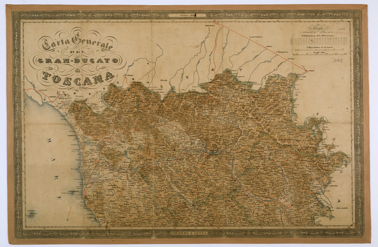 "Due fogli montati su tela a stacchi e contenuti in busta. Stampa a colori, bistro per l' orografia (sfumo), azzurro per le acque, rosso per gli abitati (distinti in base alla loro importanza amministrativa) e per le strade principali, verde per i confini. La carta è assai ricca di segni convenzionali di cui è data apposita leggenda nel foglio meridionale. Esso contiene anche le piantine di Firenze e Livorno alle scale rispettive di 1:20.000 e di 1:28.000.La carta è derivata da quellq dell' Inghirami (N° 35 d' Ordine -Cart. d' Archivio n.69 - Docum. n.3). Alla copia contenuta nella Cart. d' Archivio n.69 (Docum. n.4) si aggiunge un secondo foglio settentrionale con la sola planimetria e parte dei territori amministrativi a colori. Le due carte che compongono questo documento corrispondono ai numeri d' inventario 4383 per la parte nord e 4384 per la parte sud."
