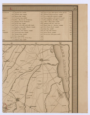 "(titolo fuori della cartella). CARTA GEOMETRICA DELLA TOSCANA RICAVATA DAL VERO NELLA PROPORZIONE DI 1:200.000 E DEDICATA A S. A. I. E R. LEOPOLDO II, ECC., DA ECC., GIOVANNI INGHIRAMI. FIRENZE (titolo sulla carta). Consta di 25 spezzoni con la sola planimetria, disegnati su carta a colori, e montati su tela con annesso quadro d'unione: è contenuta in busta. Copia della Coll. Pasqui n. 16, quattro fogli incisi su rame e montati su tela, che è la stessa carta di cui alla Coll. Bianconi n. 215 con aggiunta delle divisioni amministrative a colori."
