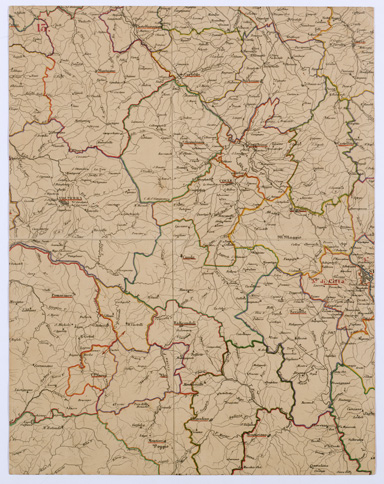 "(titolo fuori della cartella). CARTA GEOMETRICA DELLA TOSCANA RICAVATA DAL VERO NELLA PROPORZIONE DI 1:200.000 E DEDICATA A S. A. I. E R. LEOPOLDO II, ECC., DA ECC., GIOVANNI INGHIRAMI. FIRENZE (titolo sulla carta). Consta di 25 spezzoni con la sola planimetria, disegnati su carta a colori, e montati su tela con annesso quadro d'unione: è contenuta in busta. Copia della Coll. Pasqui n. 16, quattro fogli incisi su rame e montati su tela, che è la stessa carta di cui alla Coll. Bianconi n. 215 con aggiunta delle divisioni amministrative a colori."