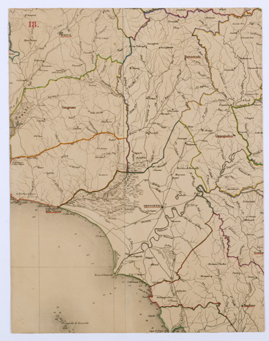 "(titolo fuori della cartella). CARTA GEOMETRICA DELLA TOSCANA RICAVATA DAL VERO NELLA PROPORZIONE DI 1:200.000 E DEDICATA A S. A. I. E R. LEOPOLDO II, ECC., DA ECC., GIOVANNI INGHIRAMI. FIRENZE (titolo sulla carta). Consta di 25 spezzoni con la sola planimetria, disegnati su carta a colori, e montati su tela con annesso quadro d'unione: è contenuta in busta. Copia della Coll. Pasqui n. 16, quattro fogli incisi su rame e montati su tela, che è la stessa carta di cui alla Coll. Bianconi n. 215 con aggiunta delle divisioni amministrative a colori."