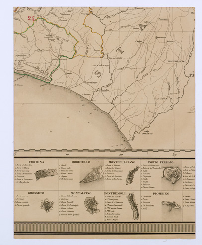"(titolo fuori della cartella). CARTA GEOMETRICA DELLA TOSCANA RICAVATA DAL VERO NELLA PROPORZIONE DI 1:200.000 E DEDICATA A S. A. I. E R. LEOPOLDO II, ECC., DA ECC., GIOVANNI INGHIRAMI. FIRENZE (titolo sulla carta). Consta di 25 spezzoni con la sola planimetria, disegnati su carta a colori, e montati su tela con annesso quadro d'unione: è contenuta in busta. Copia della Coll. Pasqui n. 16, quattro fogli incisi su rame e montati su tela, che è la stessa carta di cui alla Coll. Bianconi n. 215 con aggiunta delle divisioni amministrative a colori."