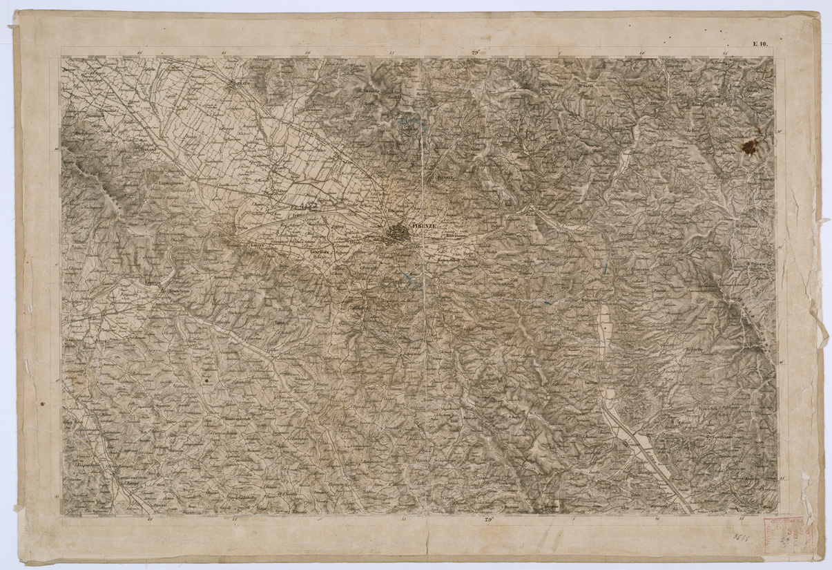 "COSTRUTTA SOPRA MISURE ASTRONOMICHE-TRIGONOMETRICHE ED INCISA SOPRA PIETRA A VIENNA NELL'I. R. I.G.M. PUBBLICATA NELL'ANNO 1851. TOPOGRAPHISCHE KARTE DES KIRCHENSTAATES UND DES GROSSHERZOGTHUMES TOSCANA NACH ASTRONOMISCH TRIGONOMETRISCHEN VERMESSUNGEN BEARBEITET UND AUF STEIN GESTOCHEN ZU WIEN IM K. K. MILITARISCHEN GEOGRAPHISCHEN INSTITUTE HERAUSSGEGEBEN IM IAHRE, 1851. Carta in 53 fogli compreso il titolo, costruita dall'I.G.M. Austriaco col consenso del Granducato e dello Stato Pontificio, poggiata su regolare triangolazione eseguita dall'Ing. Giovanni Marieni dal 1840 al 1843 e basata per la parte topografica su le mappe catastali rivedute sul terreno. Per sistema di proiezione, disegno, dimensioni, ecc., consimile alle carte alla stessa scala del Lombardo-Veneto, e dei Ducati di Modena e Parma (vedi Carta Topografica del Regno Lombardo-Veneto... n. 81 d'ordine - Cart. d'Arch. n. 52 - Docum. n. 2 e 4 Carta Topografica dei Ducati di Parma Piacenza e Guastalla... n. 8 d'ordine - Cart. d'Archivio n. 53 - Docum. n. 5 e 6 Carta Topografica del Ducato di Modena... n. 10 d'ordine - cart. d'Archivio n. 53 - Docum. n. 7 e 8). Per maggiori notizie vedasi Mori A., La cartografia ufficiale in Italia e L'I.G.M., Pagg. 69-70 e 80. La carta mostra gli abitati distinti in base alla loro importanza amministrativa, i luoghi fortificati, comuni, frazioni di comuni, boschi, prati, saline, vigne, oliveti, risaie, paludi canneti, barene, sabbie, ecc., le ferrovie, le strade di 1a e 2a classe, quelle provinciali, le comunali, le comunicazioni per carri, bestie, pedoni, argini, acquedotti, confini politici ed amministrativi, ecc. Orografia a tratteggio. Essa è inoltre sussidiata di numerose notizie geografiche, storiche e statistiche, tabelle delle elevazioni dei punti trigonometrici sul livello del mare, delle coordinate geografiche, dei luoghi principali, ecc. V'è pure annesso un quadro d'unione e un " Cenno " sulla costruzione della carta. Una delle due copie inventariate sotto il n. 85 dell'inv. gener. (carta della Biblioteca) ha una riproduzione del foglio titolo eseguita dall'I.G.M. nel 1885. La stessa carta è presente anche presso l'Archivio Cartografico (numero d' ordine 54-Cart. d'Arch.54-Docum.11 e 13) e contiene anche il Quadro d'unione corrispondente al Fogio F16 e il Foglio G6."