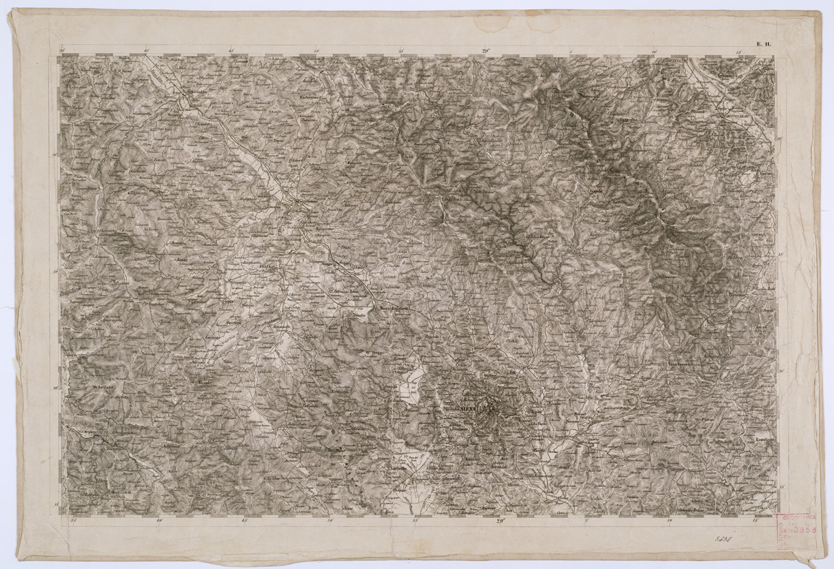 "COSTRUTTA SOPRA MISURE ASTRONOMICHE-TRIGONOMETRICHE ED INCISA SOPRA PIETRA A VIENNA NELL'I. R. I.G.M. PUBBLICATA NELL'ANNO 1851. TOPOGRAPHISCHE KARTE DES KIRCHENSTAATES UND DES GROSSHERZOGTHUMES TOSCANA NACH ASTRONOMISCH TRIGONOMETRISCHEN VERMESSUNGEN BEARBEITET UND AUF STEIN GESTOCHEN ZU WIEN IM K. K. MILITARISCHEN GEOGRAPHISCHEN INSTITUTE HERAUSSGEGEBEN IM IAHRE, 1851. Carta in 53 fogli compreso il titolo, costruita dall'I.G.M. Austriaco col consenso del Granducato e dello Stato Pontificio, poggiata su regolare triangolazione eseguita dall'Ing. Giovanni Marieni dal 1840 al 1843 e basata per la parte topografica su le mappe catastali rivedute sul terreno. Per sistema di proiezione, disegno, dimensioni, ecc., consimile alle carte alla stessa scala del Lombardo-Veneto, e dei Ducati di Modena e Parma (vedi Carta Topografica del Regno Lombardo-Veneto... n. 81 d'ordine - Cart. d'Arch. n. 52 - Docum. n. 2 e 4 Carta Topografica dei Ducati di Parma Piacenza e Guastalla... n. 8 d'ordine - Cart. d'Archivio n. 53 - Docum. n. 5 e 6 Carta Topografica del Ducato di Modena... n. 10 d'ordine - cart. d'Archivio n. 53 - Docum. n. 7 e 8). Per maggiori notizie vedasi Mori A., La cartografia ufficiale in Italia e L'I.G.M., Pagg. 69-70 e 80. La carta mostra gli abitati distinti in base alla loro importanza amministrativa, i luoghi fortificati, comuni, frazioni di comuni, boschi, prati, saline, vigne, oliveti, risaie, paludi canneti, barene, sabbie, ecc., le ferrovie, le strade di 1a e 2a classe, quelle provinciali, le comunali, le comunicazioni per carri, bestie, pedoni, argini, acquedotti, confini politici ed amministrativi, ecc. Orografia a tratteggio. Essa è inoltre sussidiata di numerose notizie geografiche, storiche e statistiche, tabelle delle elevazioni dei punti trigonometrici sul livello del mare, delle coordinate geografiche, dei luoghi principali, ecc. V'è pure annesso un quadro d'unione e un " Cenno " sulla costruzione della carta. Una delle due copie inventariate sotto il n. 85 dell'inv. gener. (carta della Biblioteca) ha una riproduzione del foglio titolo eseguita dall'I.G.M. nel 1885. La stessa carta è presente anche presso l'Archivio Cartografico (numero d' ordine 54-Cart. d'Arch.54-Docum.11 e 13) e contiene anche il Quadro d'unione corrispondente al Fogio F16 e il Foglio G6."