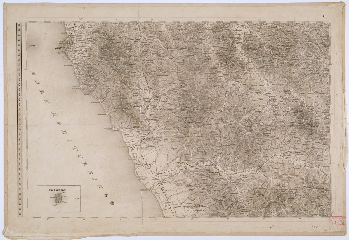 "COSTRUTTA SOPRA MISURE ASTRONOMICHE-TRIGONOMETRICHE ED INCISA SOPRA PIETRA A VIENNA NELL'I. R. I.G.M. PUBBLICATA NELL'ANNO 1851. TOPOGRAPHISCHE KARTE DES KIRCHENSTAATES UND DES GROSSHERZOGTHUMES TOSCANA NACH ASTRONOMISCH TRIGONOMETRISCHEN VERMESSUNGEN BEARBEITET UND AUF STEIN GESTOCHEN ZU WIEN IM K. K. MILITARISCHEN GEOGRAPHISCHEN INSTITUTE HERAUSSGEGEBEN IM IAHRE, 1851. Carta in 53 fogli compreso il titolo, costruita dall'I.G.M. Austriaco col consenso del Granducato e dello Stato Pontificio, poggiata su regolare triangolazione eseguita dall'Ing. Giovanni Marieni dal 1840 al 1843 e basata per la parte topografica su le mappe catastali rivedute sul terreno. Per sistema di proiezione, disegno, dimensioni, ecc., consimile alle carte alla stessa scala del Lombardo-Veneto, e dei Ducati di Modena e Parma (vedi Carta Topografica del Regno Lombardo-Veneto... n. 81 d'ordine - Cart. d'Arch. n. 52 - Docum. n. 2 e 4 Carta Topografica dei Ducati di Parma Piacenza e Guastalla... n. 8 d'ordine - Cart. d'Archivio n. 53 - Docum. n. 5 e 6 Carta Topografica del Ducato di Modena... n. 10 d'ordine - cart. d'Archivio n. 53 - Docum. n. 7 e 8). Per maggiori notizie vedasi Mori A., La cartografia ufficiale in Italia e L'I.G.M., Pagg. 69-70 e 80. La carta mostra gli abitati distinti in base alla loro importanza amministrativa, i luoghi fortificati, comuni, frazioni di comuni, boschi, prati, saline, vigne, oliveti, risaie, paludi canneti, barene, sabbie, ecc., le ferrovie, le strade di 1a e 2a classe, quelle provinciali, le comunali, le comunicazioni per carri, bestie, pedoni, argini, acquedotti, confini politici ed amministrativi, ecc. Orografia a tratteggio. Essa è inoltre sussidiata di numerose notizie geografiche, storiche e statistiche, tabelle delle elevazioni dei punti trigonometrici sul livello del mare, delle coordinate geografiche, dei luoghi principali, ecc. V'è pure annesso un quadro d'unione e un " Cenno " sulla costruzione della carta. Una delle due copie inventariate sotto il n. 85 dell'inv. gener. (carta della Biblioteca) ha una riproduzione del foglio titolo eseguita dall'I.G.M. nel 1885. La stessa carta è presente anche presso l'Archivio Cartografico (numero d' ordine 54-Cart. d'Arch.54-Docum.11 e 13) e contiene anche il Quadro d'unione corrispondente al Fogio F16 e il Foglio G6."