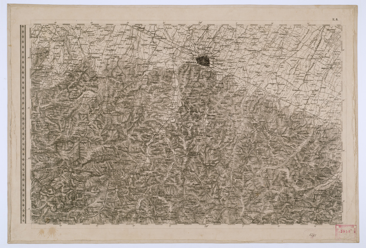 "COSTRUTTA SOPRA MISURE ASTRONOMICHE-TRIGONOMETRICHE ED INCISA SOPRA PIETRA A VIENNA NELL'I. R. I.G.M. PUBBLICATA NELL'ANNO 1851. TOPOGRAPHISCHE KARTE DES KIRCHENSTAATES UND DES GROSSHERZOGTHUMES TOSCANA NACH ASTRONOMISCH TRIGONOMETRISCHEN VERMESSUNGEN BEARBEITET UND AUF STEIN GESTOCHEN ZU WIEN IM K. K. MILITARISCHEN GEOGRAPHISCHEN INSTITUTE HERAUSSGEGEBEN IM IAHRE, 1851. Carta in 53 fogli compreso il titolo, costruita dall'I.G.M. Austriaco col consenso del Granducato e dello Stato Pontificio, poggiata su regolare triangolazione eseguita dall'Ing. Giovanni Marieni dal 1840 al 1843 e basata per la parte topografica su le mappe catastali rivedute sul terreno. Per sistema di proiezione, disegno, dimensioni, ecc., consimile alle carte alla stessa scala del Lombardo-Veneto, e dei Ducati di Modena e Parma (vedi Carta Topografica del Regno Lombardo-Veneto... n. 81 d'ordine - Cart. d'Arch. n. 52 - Docum. n. 2 e 4 Carta Topografica dei Ducati di Parma Piacenza e Guastalla... n. 8 d'ordine - Cart. d'Archivio n. 53 - Docum. n. 5 e 6 Carta Topografica del Ducato di Modena... n. 10 d'ordine - cart. d'Archivio n. 53 - Docum. n. 7 e 8). Per maggiori notizie vedasi Mori A., La cartografia ufficiale in Italia e L'I.G.M., Pagg. 69-70 e 80. La carta mostra gli abitati distinti in base alla loro importanza amministrativa, i luoghi fortificati, comuni, frazioni di comuni, boschi, prati, saline, vigne, oliveti, risaie, paludi canneti, barene, sabbie, ecc., le ferrovie, le strade di 1a e 2a classe, quelle provinciali, le comunali, le comunicazioni per carri, bestie, pedoni, argini, acquedotti, confini politici ed amministrativi, ecc. Orografia a tratteggio. Essa è inoltre sussidiata di numerose notizie geografiche, storiche e statistiche, tabelle delle elevazioni dei punti trigonometrici sul livello del mare, delle coordinate geografiche, dei luoghi principali, ecc. V'è pure annesso un quadro d'unione e un " Cenno " sulla costruzione della carta. Una delle due copie inventariate sotto il n. 85 dell'inv. gener. (carta della Biblioteca) ha una riproduzione del foglio titolo eseguita dall'I.G.M. nel 1885. La stessa carta è presente anche presso l'Archivio Cartografico (numero d' ordine 54-Cart. d'Arch.54-Docum.11 e 13) e contiene anche il Quadro d'unione corrispondente al Fogio F16 e il Foglio G6."