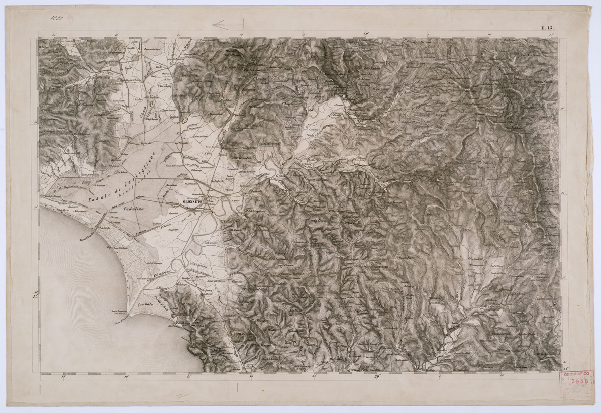 "COSTRUTTA SOPRA MISURE ASTRONOMICHE-TRIGONOMETRICHE ED INCISA SOPRA PIETRA A VIENNA NELL'I. R. I.G.M. PUBBLICATA NELL'ANNO 1851.TOPOGRAPHISCHE KARTE DES KIRCHENSTAATES UND DES GROSSHERZOGTHUMES TOSCANA NACH ASTRONOMISCH TRIGONOMETRISCHEN VERMESSUNGEN BEARBEITET UND AUF STEIN GESTOCHEN ZU WIEN IM K. K. MILITARISCHEN GEOGRAPHISCHEN INSTITUTE HERAUSSGEGEBEN IM IAHRE, 1851. Carta in 53 fogli compreso il titolo, costruita dall'I.G.M. Austriaco col consenso del Granducato e dello Stato Pontificio, poggiata su regolare triangolazione eseguita dall'Ing. Giovanni Marieni dal 1840 al 1843 e basata per la parte topografica su le mappe catastali rivedute sul terreno. Per sistema di proiezione, disegno, dimensioni, ecc., consimile alle carte alla stessa scala del Lombardo-Veneto, e dei Ducati di Modena e Parma (vedi Carta Topografica del Regno Lombardo-Veneto... n. 81 d'ordine - Cart. d'Arch. n. 52 - Docum. n. 2 e 4 Carta Topografica dei Ducati di Parma Piacenza e Guastalla... n. 8 d'ordine - Cart. d'Archivio n. 53 - Docum. n. 5 e 6 Carta Topografica del Ducato di Modena... n. 10 d'ordine - cart. d'Archivio n. 53 - Docum. n. 7 e 8). Per maggiori notizie vedasi Mori A., La cartografia ufficiale in Italia e L'I.G.M., Pagg. 69-70 e 80. La carta mostra gli abitati distinti in base alla loro importanza amministrativa, i luoghi fortificati, comuni, frazioni di comuni, boschi, prati, saline, vigne, oliveti, risaie, paludi canneti, barene, sabbie, ecc., le ferrovie, le strade di 1a e 2a classe, quelle provinciali, le comunali, le comunicazioni per carri, bestie, pedoni, argini, acquedotti, confini politici ed amministrativi, ecc. Orografia a tratteggio. Essa è inoltre sussidiata di numerose notizie geografiche, storiche e statistiche, tabelle delle elevazioni dei punti trigonometrici sul livello del mare, delle coordinate geografiche, dei luoghi principali, ecc. V'è pure annesso un quadro d'unione e un " Cenno " sulla costruzione della carta. Una delle due copie inventariate sotto il n. 85 dell'inv. gener. (carta della Biblioteca) ha una riproduzione del foglio titolo eseguita dall'I.G.M. nel 1885. La stessa carta è presente anche presso l'Archivio Cartografico (numero d' ordine 54-Cart. d'Arch.54-Docum.11 e 13) e contiene anche il Quadro d'unione corrispondente al Fogio F16 (file A0006141) e il Foglio G6."