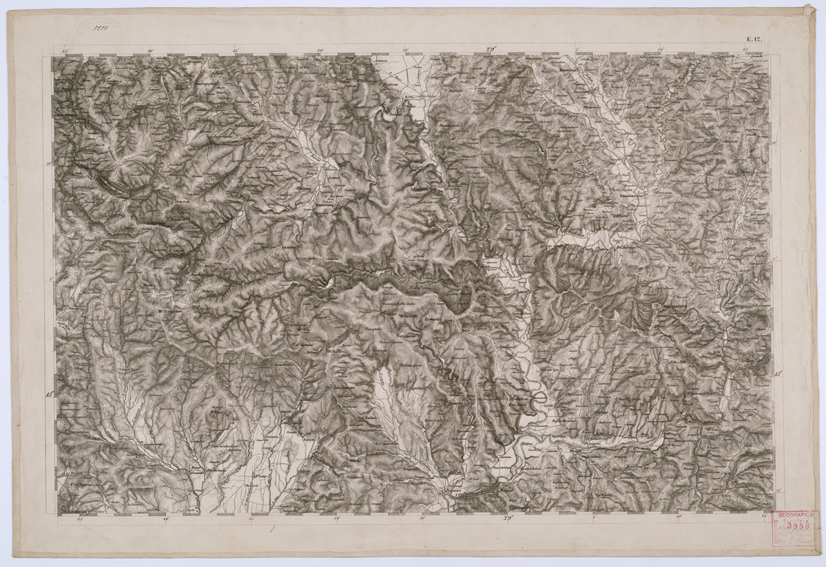 "COSTRUTTA SOPRA MISURE ASTRONOMICHE-TRIGONOMETRICHE ED INCISA SOPRA PIETRA A VIENNA NELL'I. R. I.G.M. PUBBLICATA NELL'ANNO 1851. TOPOGRAPHISCHE KARTE DES KIRCHENSTAATES UND DES GROSSHERZOGTHUMES TOSCANA NACH ASTRONOMISCH TRIGONOMETRISCHEN VERMESSUNGEN BEARBEITET UND AUF STEIN GESTOCHEN ZU WIEN IM K. K. MILITARISCHEN GEOGRAPHISCHEN INSTITUTE HERAUSSGEGEBEN IM IAHRE, 1851. Carta in 53 fogli compreso il titolo, costruita dall'I.G.M. Austriaco col consenso del Granducato e dello Stato Pontificio, poggiata su regolare triangolazione eseguita dall'Ing. Giovanni Marieni dal 1840 al 1843 e basata per la parte topografica su le mappe catastali rivedute sul terreno. Per sistema di proiezione, disegno, dimensioni, ecc., consimile alle carte alla stessa scala del Lombardo-Veneto, e dei Ducati di Modena e Parma (vedi Carta Topografica del Regno Lombardo-Veneto... n. 81 d'ordine - Cart. d'Arch. n. 52 - Docum. n. 2 e 4 Carta Topografica dei Ducati di Parma Piacenza e Guastalla... n. 8 d'ordine - Cart. d'Archivio n. 53 - Docum. n. 5 e 6 Carta Topografica del Ducato di Modena... n. 10 d'ordine - cart. d'Archivio n. 53 - Docum. n. 7 e 8). Per maggiori notizie vedasi Mori A., La cartografia ufficiale in Italia e L'I.G.M., Pagg. 69-70 e 80. La carta mostra gli abitati distinti in base alla loro importanza amministrativa, i luoghi fortificati, comuni, frazioni di comuni, boschi, prati, saline, vigne, oliveti, risaie, paludi canneti, barene, sabbie, ecc., le ferrovie, le strade di 1a e 2a classe, quelle provinciali, le comunali, le comunicazioni per carri, bestie, pedoni, argini, acquedotti, confini politici ed amministrativi, ecc. Orografia a tratteggio. Essa è inoltre sussidiata di numerose notizie geografiche, storiche e statistiche, tabelle delle elevazioni dei punti trigonometrici sul livello del mare, delle coordinate geografiche, dei luoghi principali, ecc. V'è pure annesso un quadro d'unione e un " Cenno " sulla costruzione della carta. Una delle due copie inventariate sotto il n. 85 dell'inv. gener. (carta della Biblioteca) ha una riproduzione del foglio titolo eseguita dall'I.G.M. nel 1885. La stessa carta è presente anche presso l'Archivio Cartografico (numero d' ordine 54-Cart. d'Arch.54-Docum.11 e 13) e contiene anche il Quadro d'unione corrispondente al Fogio F16 e il Foglio G6."