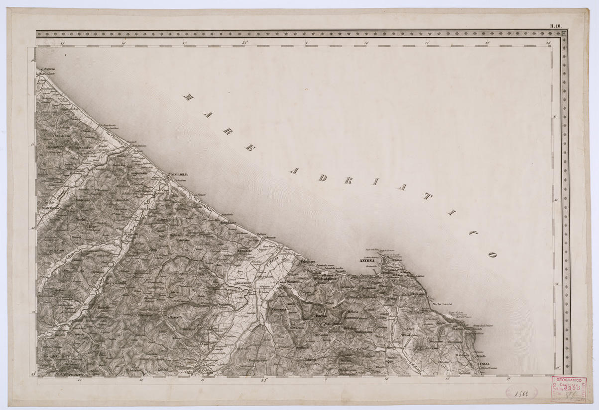 "COSTRUTTA SOPRA MISURE ASTRONOMICHE-TRIGONOMETRICHE ED INCISA SOPRA PIETRA A VIENNA NELL'I. R. I.G.M. PUBBLICATA NELL'ANNO 1851. TOPOGRAPHISCHE KARTE DES KIRCHENSTAATES UND DES GROSSHERZOGTHUMES TOSCANA NACH ASTRONOMISCH TRIGONOMETRISCHEN VERMESSUNGEN BEARBEITET UND AUF STEIN GESTOCHEN ZU WIEN IM K. K. MILITARISCHEN GEOGRAPHISCHEN INSTITUTE HERAUSSGEGEBEN IM IAHRE, 1851. Carta in 53 fogli compreso il titolo, costruita dall'I.G.M. Austriaco col consenso del Granducato e dello Stato Pontificio, poggiata su regolare triangolazione eseguita dall'Ing. Giovanni Marieni dal 1840 al 1843 e basata per la parte topografica su le mappe catastali rivedute sul terreno. Per sistema di proiezione, disegno, dimensioni, ecc., consimile alle carte alla stessa scala del Lombardo-Veneto, e dei Ducati di Modena e Parma (vedi Carta Topografica del Regno Lombardo-Veneto... n. 81 d'ordine - Cart. d'Arch. n. 52 - Docum. n. 2 e 4 Carta Topografica dei Ducati di Parma Piacenza e Guastalla... n. 8 d'ordine - Cart. d'Archivio n. 53 - Docum. n. 5 e 6 Carta Topografica del Ducato di Modena... n. 10 d'ordine - cart. d'Archivio n. 53 - Docum. n. 7 e 8). Per maggiori notizie vedasi Mori A., La cartografia ufficiale in Italia e L'I.G.M., Pagg. 69-70 e 80. La carta mostra gli abitati distinti in base alla loro importanza amministrativa, i luoghi fortificati, comuni, frazioni di comuni, boschi, prati, saline, vigne, oliveti, risaie, paludi canneti, barene, sabbie, ecc., le ferrovie, le strade di 1a e 2a classe, quelle provinciali, le comunali, le comunicazioni per carri, bestie, pedoni, argini, acquedotti, confini politici ed amministrativi, ecc. Orografia a tratteggio. Essa è inoltre sussidiata di numerose notizie geografiche, storiche e statistiche, tabelle delle elevazioni dei punti trigonometrici sul livello del mare, delle coordinate geografiche, dei luoghi principali, ecc. V'è pure annesso un quadro d'unione e un " Cenno " sulla costruzione della carta. Una delle due copie inventariate sotto il n. 85 dell'inv. gener. (carta della Biblioteca) ha una riproduzione del foglio titolo eseguita dall'I.G.M. nel 1885. La stessa carta è presente anche presso l'Archivio Cartografico (numero d' ordine 54-Cart. d'Arch.54-Docum.11 e 13) e contiene anche il Quadro d'unione corrispondente al Fogio F16 e il Foglio G6."