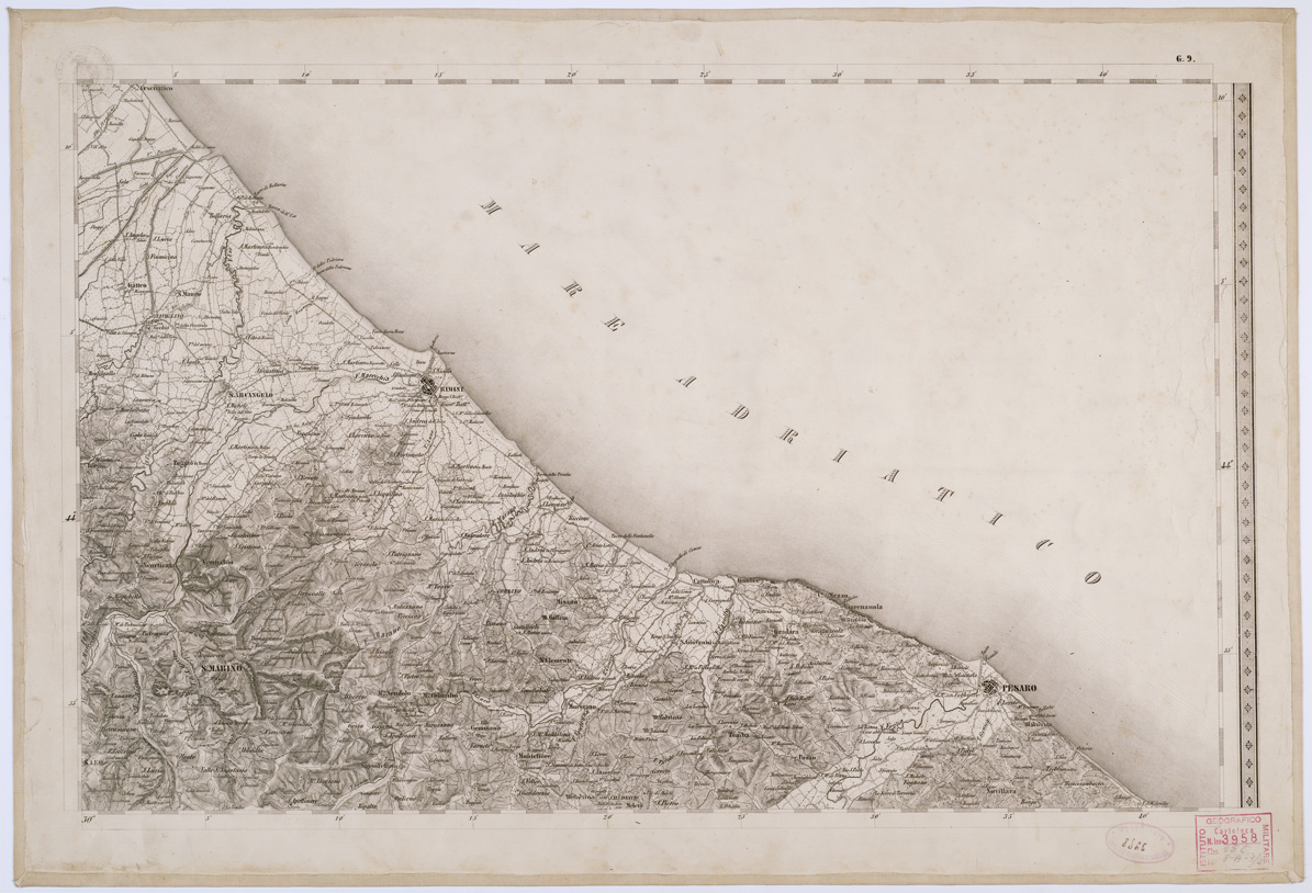 "COSTRUTTA SOPRA MISURE ASTRONOMICHE-TRIGONOMETRICHE ED INCISA SOPRA PIETRA A VIENNA NELL'I. R. I.G.M. PUBBLICATA NELL'ANNO 1851. TOPOGRAPHISCHE KARTE DES KIRCHENSTAATES UND DES GROSSHERZOGTHUMES TOSCANA NACH ASTRONOMISCH TRIGONOMETRISCHEN VERMESSUNGEN BEARBEITET UND AUF STEIN GESTOCHEN ZU WIEN IM K. K. MILITARISCHEN GEOGRAPHISCHEN INSTITUTE HERAUSSGEGEBEN IM IAHRE, 1851. Carta in 53 fogli compreso il titolo, costruita dall'I.G.M. Austriaco col consenso del Granducato e dello Stato Pontificio, poggiata su regolare triangolazione eseguita dall'Ing. Giovanni Marieni dal 1840 al 1843 e basata per la parte topografica su le mappe catastali rivedute sul terreno. Per sistema di proiezione, disegno, dimensioni, ecc., consimile alle carte alla stessa scala del Lombardo-Veneto, e dei Ducati di Modena e Parma (vedi Carta Topografica del Regno Lombardo-Veneto... n. 81 d'ordine - Cart. d'Arch. n. 52 - Docum. n. 2 e 4 Carta Topografica dei Ducati di Parma Piacenza e Guastalla... n. 8 d'ordine - Cart. d'Archivio n. 53 - Docum. n. 5 e 6 Carta Topografica del Ducato di Modena... n. 10 d'ordine - cart. d'Archivio n. 53 - Docum. n. 7 e 8). Per maggiori notizie vedasi Mori A., La cartografia ufficiale in Italia e L'I.G.M., Pagg. 69-70 e 80. La carta mostra gli abitati distinti in base alla loro importanza amministrativa, i luoghi fortificati, comuni, frazioni di comuni, boschi, prati, saline, vigne, oliveti, risaie, paludi canneti, barene, sabbie, ecc., le ferrovie, le strade di 1a e 2a classe, quelle provinciali, le comunali, le comunicazioni per carri, bestie, pedoni, argini, acquedotti, confini politici ed amministrativi, ecc. Orografia a tratteggio. Essa è inoltre sussidiata di numerose notizie geografiche, storiche e statistiche, tabelle delle elevazioni dei punti trigonometrici sul livello del mare, delle coordinate geografiche, dei luoghi principali, ecc. V'è pure annesso un quadro d'unione e un " Cenno " sulla costruzione della carta. Una delle due copie inventariate sotto il n. 85 dell'inv. gener. (carta della Biblioteca) ha una riproduzione del foglio titolo eseguita dall'I.G.M. nel 1885. La stessa carta è presente anche presso l'Archivio Cartografico (numero d' ordine 54-Cart. d'Arch.54-Docum.11 e 13) e contiene anche il Quadro d'unione corrispondente al Fogio F16 e il Foglio G6."
