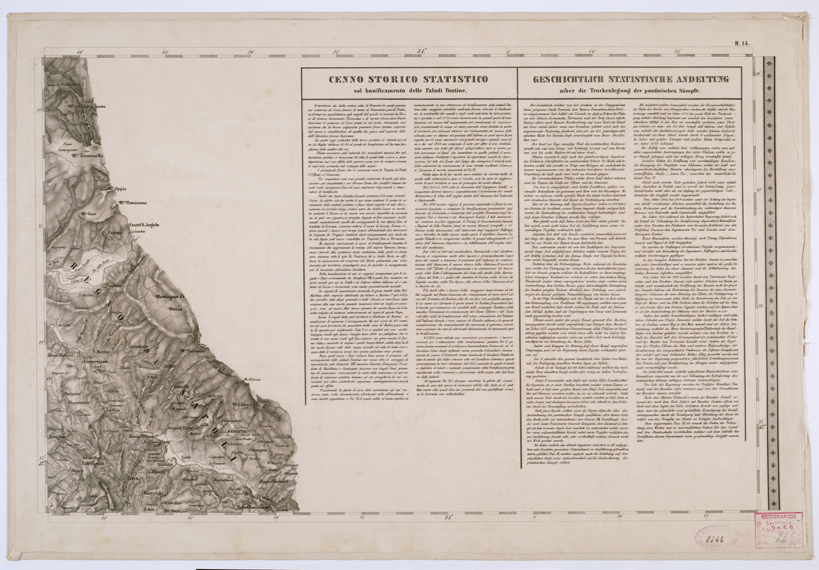 "COSTRUTTA SOPRA MISURE ASTRONOMICHE-TRIGONOMETRICHE ED INCISA SOPRA PIETRA A VIENNA NELL'I. R. I.G.M. PUBBLICATA NELL'ANNO 1851. TOPOGRAPHISCHE KARTE DES KIRCHENSTAATES UND DES GROSSHERZOGTHUMES TOSCANA NACH ASTRONOMISCH TRIGONOMETRISCHEN VERMESSUNGEN BEARBEITET UND AUF STEIN GESTOCHEN ZU WIEN IM K. K. MILITARISCHEN GEOGRAPHISCHEN INSTITUTE HERAUSSGEGEBEN IM IAHRE, 1851. Carta in 53 fogli compreso il titolo, costruita dall'I.G.M. Austriaco col consenso del Granducato e dello Stato Pontificio, poggiata su regolare triangolazione eseguita dall'Ing. Giovanni Marieni dal 1840 al 1843 e basata per la parte topografica su le mappe catastali rivedute sul terreno. Per sistema di proiezione, disegno, dimensioni, ecc., consimile alle carte alla stessa scala del Lombardo-Veneto, e dei Ducati di Modena e Parma (vedi Carta Topografica del Regno Lombardo-Veneto... n. 81 d'ordine - Cart. d'Arch. n. 52 - Docum. n. 2 e 4 Carta Topografica dei Ducati di Parma Piacenza e Guastalla... n. 8 d'ordine - Cart. d'Archivio n. 53 - Docum. n. 5 e 6 Carta Topografica del Ducato di Modena... n. 10 d'ordine - cart. d'Archivio n. 53 - Docum. n. 7 e 8). Per maggiori notizie vedasi Mori A., La cartografia ufficiale in Italia e L'I.G.M., Pagg. 69-70 e 80. La carta mostra gli abitati distinti in base alla loro importanza amministrativa, i luoghi fortificati, comuni, frazioni di comuni, boschi, prati, saline, vigne, oliveti, risaie, paludi canneti, barene, sabbie, ecc., le ferrovie, le strade di 1a e 2a classe, quelle provinciali, le comunali, le comunicazioni per carri, bestie, pedoni, argini, acquedotti, confini politici ed amministrativi, ecc. Orografia a tratteggio. Essa è inoltre sussidiata di numerose notizie geografiche, storiche e statistiche, tabelle delle elevazioni dei punti trigonometrici sul livello del mare, delle coordinate geografiche, dei luoghi principali, ecc. V'è pure annesso un quadro d'unione e un " Cenno " sulla costruzione della carta. Una delle due copie inventariate sotto il n. 85 dell'inv. gener. (carta della Biblioteca) ha una riproduzione del foglio titolo eseguita dall'I.G.M. nel 1885. La stessa carta è presente anche presso l'Archivio Cartografico (numero d' ordine 54-Cart. d'Arch.54-Docum.11 e 13) e contiene anche il Quadro d'unione corrispondente al Fogio F16 e il Foglio G6."