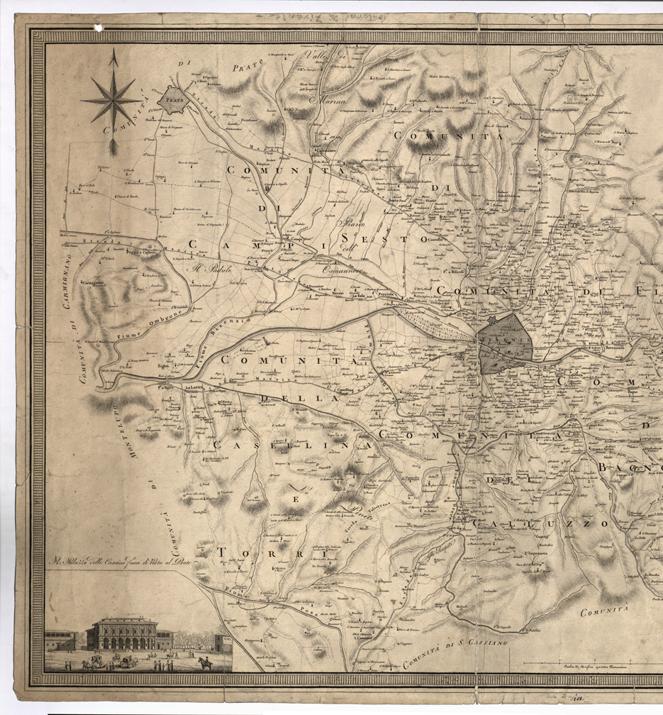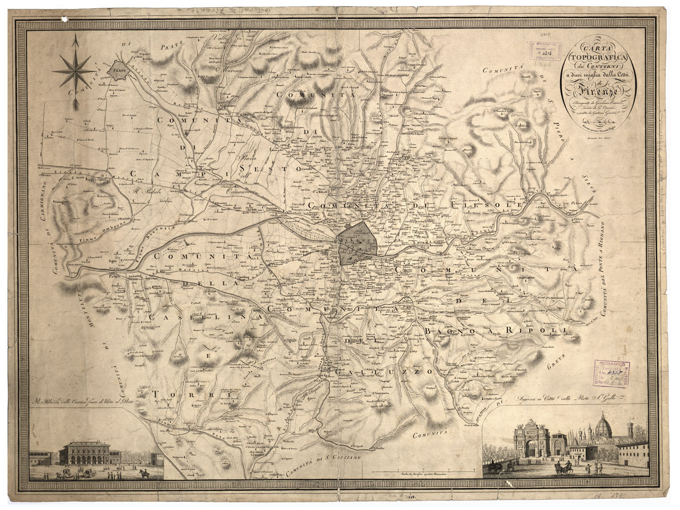 "Incisione su rame in foglio unico stampato in nero. Orografia rappresentata schematicamente a tratteggio. Abitati distinti secondo l´importanza ecclesiastico amministrativa. Sono tracciate le strade principali e le secondarie. Assai dettagliata l'idrografia. In basso agli angoli sono presenti vedute: "R. Palazzo delle Cascine fuori di Porta al Prato" e "Ingresso in città dalla Porta San Gallo". Limiti: sud, "Comunità di San Cassiano", sud-est "Comunità di Greve", est "Comunità del Ponte a Rignano",nord-est "Comunità di San Piero a Sieve", nord "Comunità di Prato" ovest " Comunità di Carmignano, sud-ovest "Comunità di Montelupo". Cfr. ARRIGONI e BERTARELLI, Le carte geografiche dell'Italia, ecc., n. 1980. E' catalogata a pag 330 del "Catalogo Ragionato-parte seconda" dell'Istituto Geografico Militare" (gruppo 9-n° d'ordine 79) Altro esemplare è al n. 4493 d'Inventario generale, collocazione 31-C-2 "