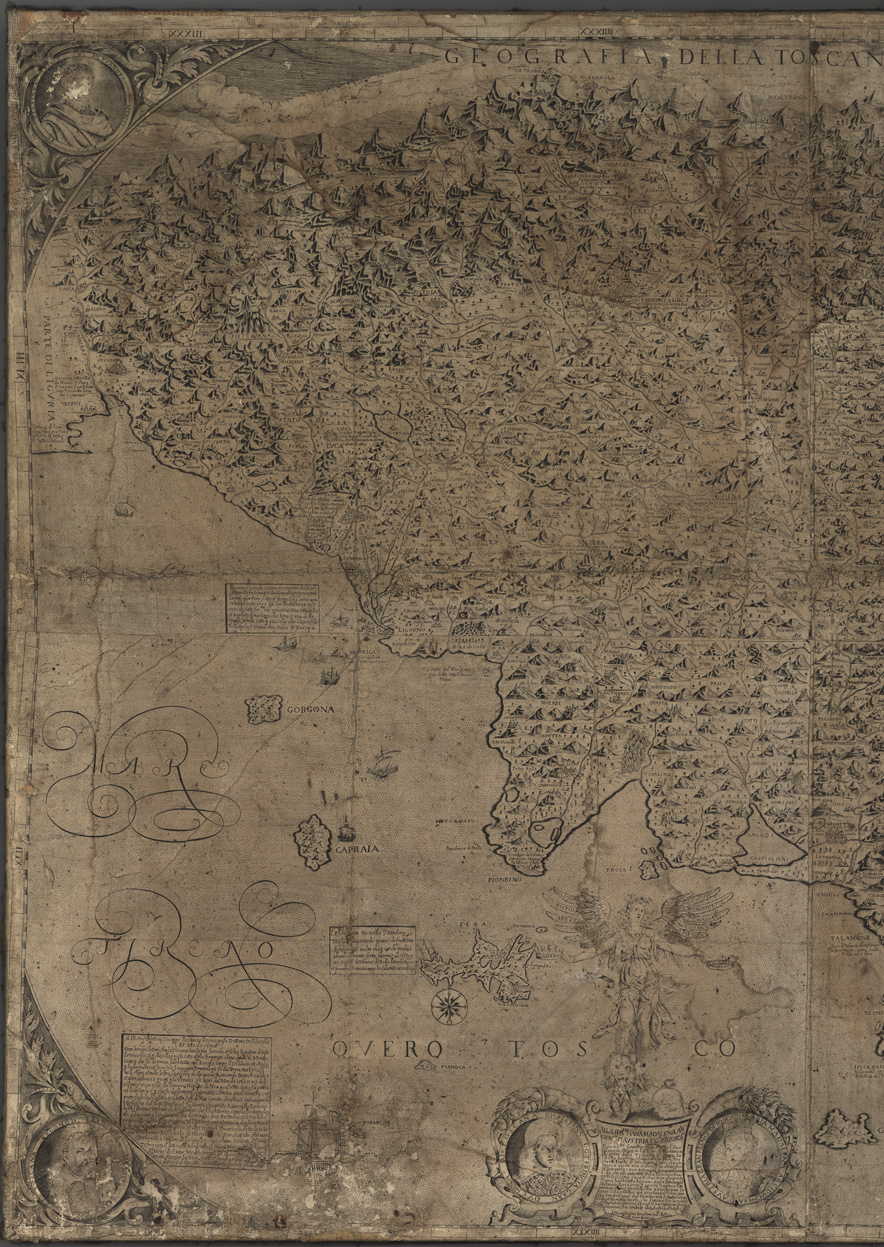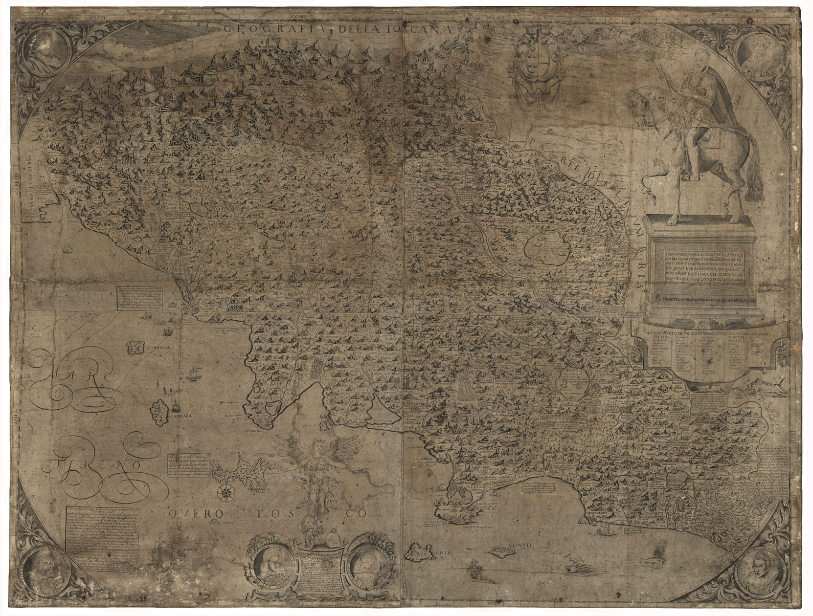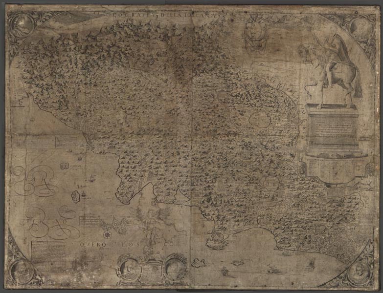 "Questa carta, nota come la "Carta del Cavallo", venne disegnata verso il 1609 da Giuseppe Rosaccio. (1620 anno della sua morte). Di essa rimane tuttavia soltanto la copia eseguita nel 1662 da Stefano Scolari pure rarissima. In alto a destra è raffigurato Ferdinando de´ Medici a cavallo (donde il nome della carta) con sotto la scritta "Ferdinando Medici Gran Duca di Toscana, ecc.", cui segue "In Venetia Appresso Stefano Scolari As. Zuliani 1662" e a destra "Stefano Scolari F.": sotto ancora v'è un elenco dei "Luochi sotto di Falisci et Veienti contenuti nella Toscana". In basso al centro fra i ritratti di "Cristina Loteringia" e di "Maria Maddalena" una dedica alla stessa Maria Maddalena firmata da Aloisio Rosaccio, figlio di Giuseppe. A sinistra una dedica "A Discreti lettori Giuseppe Rosaccio Cosmografo Dottore in Filosofia et Medicina, etc." La carta mostra l'orografia col consueto metodo dei monticelli, indica gli abitati schematicamente in prospettiva: distingue, selve, ponti, confini: manca la rete stradale. E' ricca di leggende storico-descrittive. Manca la scala grafica, ma v'è la graduazione marginale. Circa questa opera del Rosaccio, che è un misto delle preesistenti produzioni del Bellarmato e del Magini, senza peraltro portare alcun progresso alla cartografia della Toscana si cfr. ALMAGIA R., Monumenta Italiae Cartographica, ecc., pag. 44 e GENOVIE L., Le due carte della Toscana dipinte nella Galleria degli Uffizi, in "L'Universo", 1927, n. 6. L'esemplare posseduto è montato su tela sostenuto da un telaio in legno."