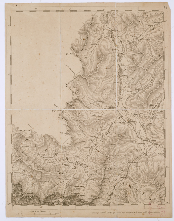 "Questa Carta è un ingrandimento meccanico della Carta alla Scala di 1:86.400 pubblicata mediante incisione dall'I.R. Istituto Geografico di Vienna. Essa venne riconosciuta sul terreno e messa al corrente per i corsi d'acqua importanti e per le strade rotabili a fondo artificiale e riprodotta in fotolitografia dall'Istituto Topografico Militare Italiano."