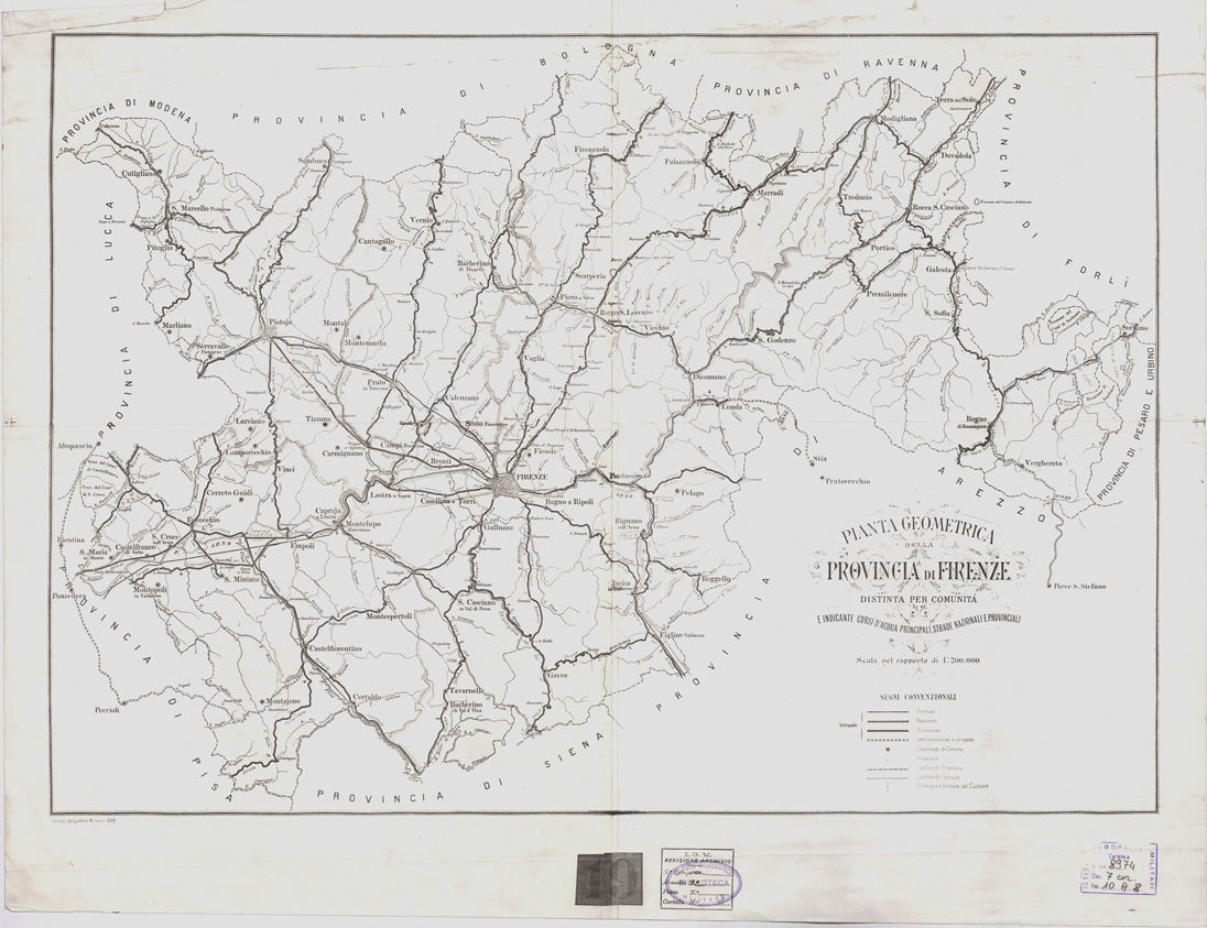 PIANTA GEOMETRICA DELLA PROVINCIA DI FIRENZE DISTINTA PER COMUNITA'E INDICANTE CORSI D'ACQUA PRINCIPALI, STRADE NAZIONALI E PROVINCIALI.