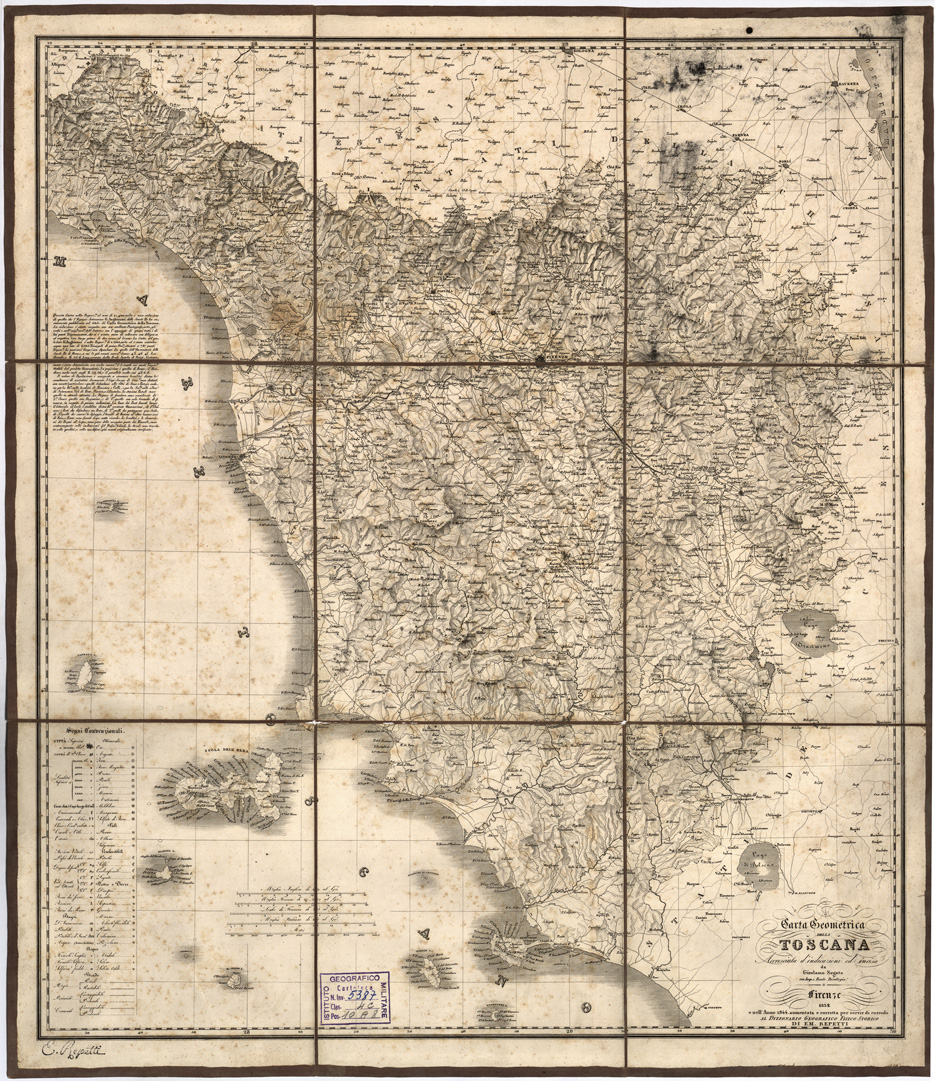 "Carta accresciuta ed incisa da Girolamo Segato con Imp. e Reale Privilegio. Nell'Anno 1844 aumentata e corretta per servir di corredo al Dizionario Geografico Fisico Storico di Em. Repetti. Questa carta è una riduzione di quella che l'Egregio Astronomo G. Inghirami delle Scuole Pie ha pubblicata col titolo di Carta Geometrica della Toscana. Disponibile stampa vedasi B20 catalogo vendite."