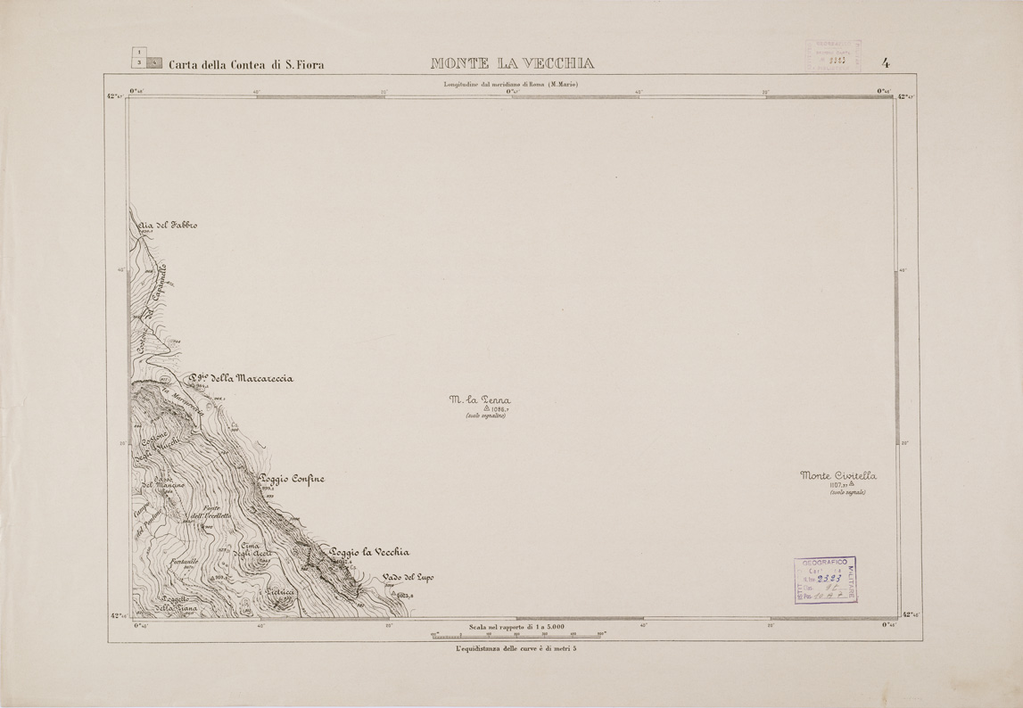 "Carta in 10 fogli stampati in nero con orografia dimostrata a mezzo di curve di livello tracciate alla equidistanza di 5 m. e curve punteggiate alla equidistanza di 1 m. La carta distingue abitati, strade (rotabili, comunali, private, non sempre praticabili, campestri, mulattiere, sentieri) acquedotti, siepi, muri, gallerie, linee d'impluvio, capisaldi, ecc. Annesso il foglio titolo con quadro d'unione, la leggenda dei segni convenzionali e la firma "Angelo Marini topografo, Firenze, dicembre 1918". Confronta anche al numero d' inventario 2323 bis " Santa Fiora IIINE " - scala 1:25.000 - edizione del 1885."