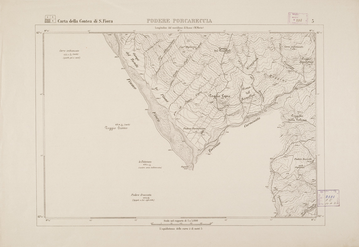 "Carta in 10 fogli stampati in nero con orografia dimostrata a mezzo di curve di livello tracciate alla equidistanza di 5 m. e curve punteggiate alla equidistanza di 1 m. La carta distingue abitati, strade (rotabili, comunali, private, non sempre praticabili, campestri, mulattiere, sentieri) acquedotti, siepi, muri, gallerie, linee d'impluvio, capisaldi, ecc. Annesso il foglio titolo con quadro d'unione, la leggenda dei segni convenzionali e la firma "Angelo Marini topografo, Firenze, dicembre 1918". Confronta anche al numero d' inventario 2323 bis " Santa Fiora IIINE " - scala 1:25.000 - edizione del 1885."