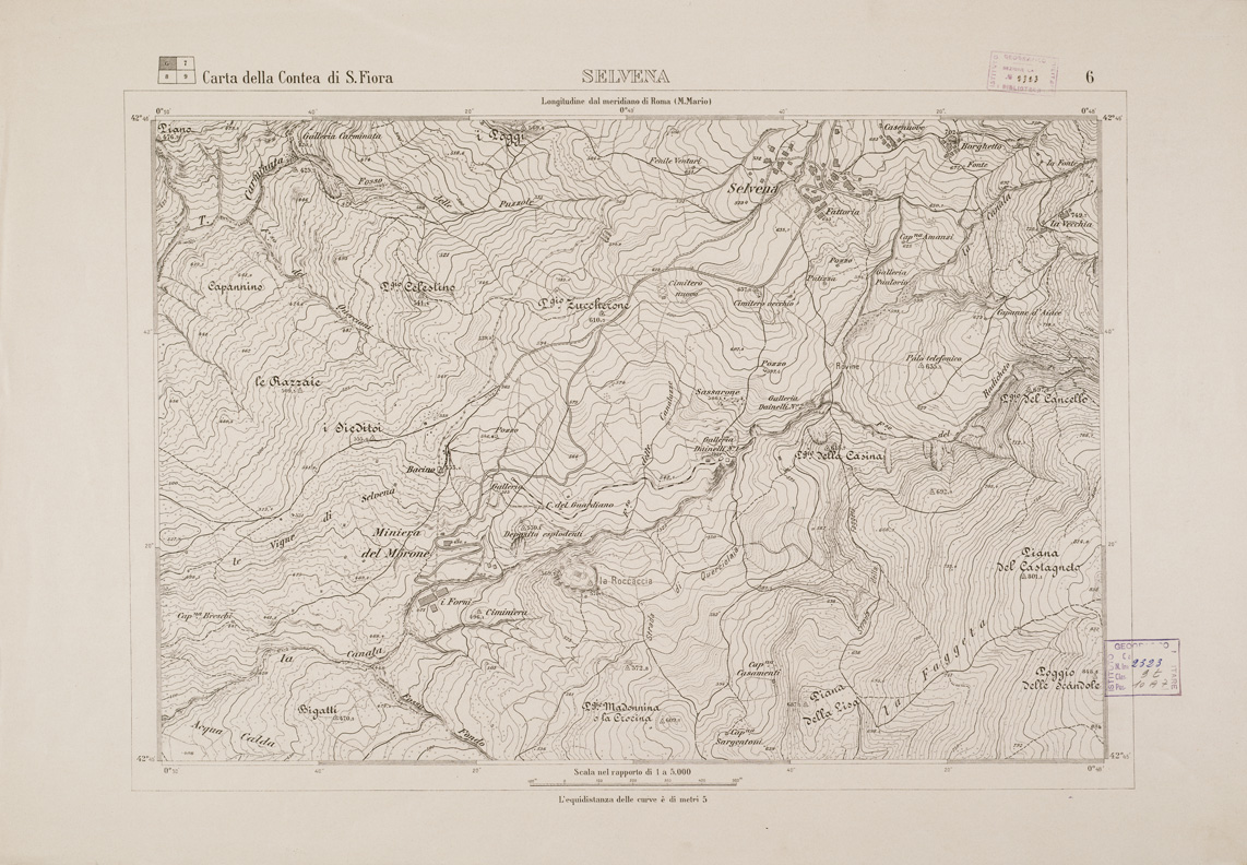 "Carta in 10 fogli stampati in nero con orografia dimostrata a mezzo di curve di livello tracciate alla equidistanza di 5 m. e curve punteggiate alla equidistanza di 1 m. La carta distingue abitati, strade (rotabili, comunali, private, non sempre praticabili, campestri, mulattiere, sentieri) acquedotti, siepi, muri, gallerie, linee d'impluvio, capisaldi, ecc. Annesso il foglio titolo con quadro d'unione, la leggenda dei segni convenzionali e la firma "Angelo Marini topografo, Firenze, dicembre 1918". Confronta anche al numero d' inventario 2323 bis " Santa Fiora IIINE " - scala 1:25.000 - edizione del 1885."