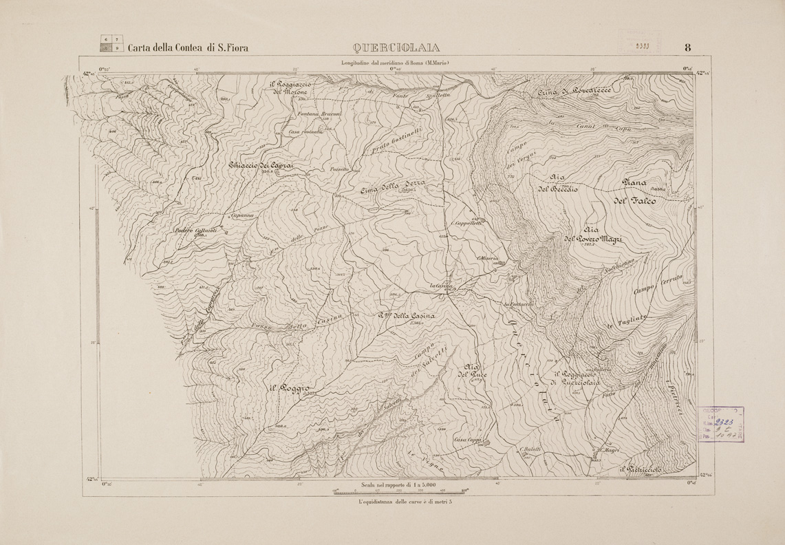 "Carta in 10 fogli stampati in nero con orografia dimostrata a mezzo di curve di livello tracciate alla equidistanza di 5 m. e curve punteggiate alla equidistanza di 1 m. La carta distingue abitati, strade (rotabili, comunali, private, non sempre praticabili, campestri, mulattiere, sentieri) acquedotti, siepi, muri, gallerie, linee d'impluvio, capisaldi, ecc. Annesso il foglio titolo con quadro d'unione, la leggenda dei segni convenzionali e la firma "Angelo Marini topografo, Firenze, dicembre 1918". Confronta anche al numero d' inventario 2323 bis " Santa Fiora IIINE " - scala 1:25.000 - edizione del 1885."