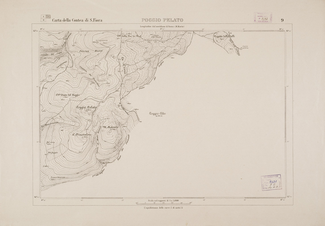 "Carta in 10 fogli stampati in nero con orografia dimostrata a mezzo di curve di livello tracciate alla equidistanza di 5 m. e curve punteggiate alla equidistanza di 1 m. La carta distingue abitati, strade (rotabili, comunali, private, non sempre praticabili, campestri, mulattiere, sentieri) acquedotti, siepi, muri, gallerie, linee d'impluvio, capisaldi, ecc. Annesso il foglio titolo con quadro d'unione, la leggenda dei segni convenzionali e la firma "Angelo Marini topografo, Firenze, dicembre 1918". Confronta anche al numero d' inventario 2323 bis " Santa Fiora IIINE " - scala 1:25.000 - edizione del 1885."