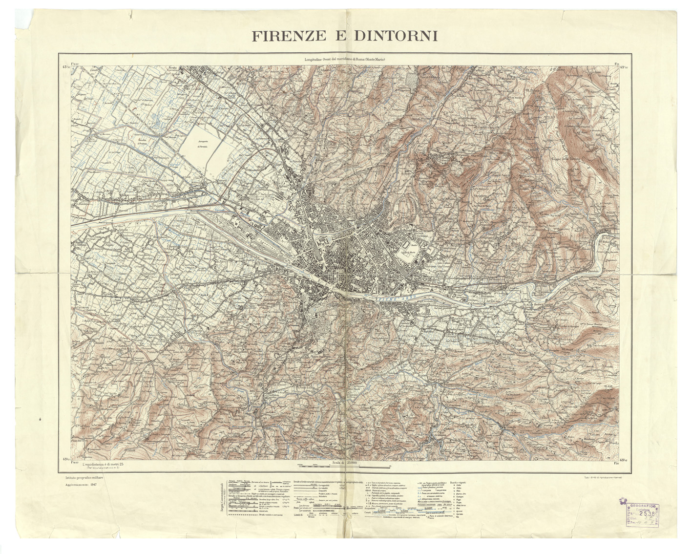 "Curve di livello con equidistanza di 25 metri. In basso i segni convenzionali. I.G.M. (FI)."