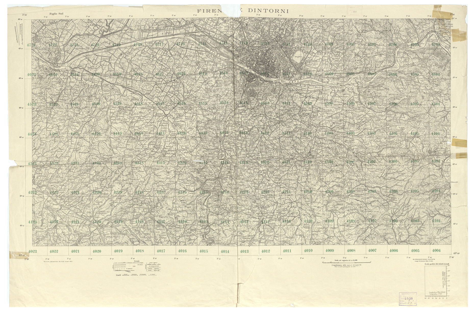 "I.G.M. (FI). L'equidistanza delle curve è di metri 25, per le curve punteggiate di metri 5."