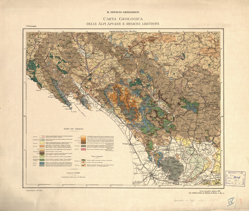 CARTA GEOLOGICA DELLE ALPI APUANE E REGIONI LIMITROFE D.ZACCAGNA. DESCRIZIONE DELLE ALPI APUANE. I.G.M. 1899.