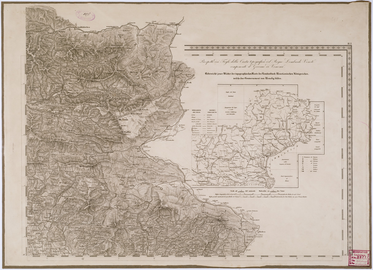 "Carta costrutta sopra misure astronomico-trigonometriche ed incisa a Milano nell'I.G.M. dell'I.R. Stato Maggiore Generale Austriaco. Rappresentazione orografica a tratteggio. Annesso quadro d'unione del Veneto."