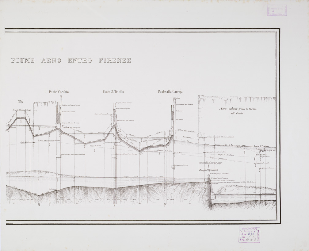 "RILEVATO COLLA DIREZIONE DI ALESSANDRO MANETTI DIRETTORE GENERALE DELLE ACQUE E STRADE. DALL'INGEGNERE FRANCESCO RENARD. PER SERVIRE AL REGOLAMENTO DEI NOMINATI CORSI D'ACQUA ED AI FUTURI CONFRONTI COL LORO PRESENTE STATO NELL'ANNO 1848. Carta in 8 fogli autografati nello stabilimento Bellamy in Firenze. Sono riuniti e contenuti entro una copertina su cui trovasi scritto: "Il presente profilo servendo a chiarire le questioni agitate nelle scritture idrauliche del Padre Corsini, del Prony, dell'Humboldt, del Tadini, del Fossombroni, del Manetti, del Libri, del Guasti e del Lombardini, può formare utile corredo alle dette scritture. Le quali si trovano riunite nel Tomo VII di supplemento alla Raccolta degli Autori che trattano nel moto delle acque, impresso in Bologna nel 1845 alla tipografia governativa della Volpe, e reperibile in Firenze presso il Molini". Annesso il foglio titolo e una carta del "Corso dell'Arno e dei suoi Principali influenti" alla scala di 1:330.720 circa e che mostra le zone che rimasero sommerse nella inondazione del 3 novembre 1844. Due copie."