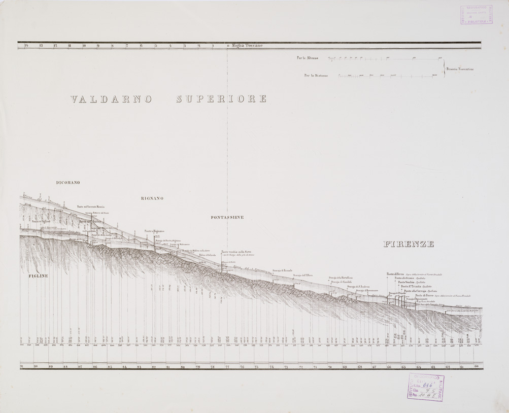 "RILEVATO COLLA DIREZIONE DI ALESSANDRO MANETTI DIRETTORE GENERALE DELLE ACQUE E STRADE. DALL'INGEGNERE FRANCESCO RENARD. PER SERVIRE AL REGOLAMENTO DEI NOMINATI CORSI D'ACQUA ED AI FUTURI CONFRONTI COL LORO PRESENTE STATO NELL'ANNO 1848. Carta in 8 fogli autografati nello stabilimento Bellamy in Firenze. Sono riuniti e contenuti entro una copertina su cui trovasi scritto: "Il presente profilo servendo a chiarire le questioni agitate nelle scritture idrauliche del Padre Corsini, del Prony, dell'Humboldt, del Tadini, del Fossombroni, del Manetti, del Libri, del Guasti e del Lombardini, può formare utile corredo alle dette scritture. Le quali si trovano riunite nel Tomo VII di supplemento alla Raccolta degli Autori che trattano nel moto delle acque, impresso in Bologna nel 1845 alla tipografia governativa della Volpe, e reperibile in Firenze presso il Molini". Annesso il foglio titolo e una carta del "Corso dell'Arno e dei suoi Principali influenti" alla scala di 1:330.720 circa e che mostra le zone che rimasero sommerse nella inondazione del 3 novembre 1844. Due copie."
