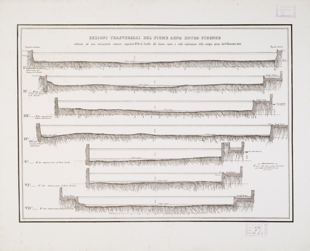 "RILEVATO COLLA DIREZIONE DI ALESSANDRO MANETTI DIRETTORE GENERALE DELLE ACQUE E STRADE. DALL'INGEGNERE FRANCESCO RENARD. PER SERVIRE AL REGOLAMENTO DEI NOMINATI CORSI D'ACQUA ED AI FUTURI CONFRONTI COL LORO PRESENTE STATO NELL'ANNO 1848. Carta in 8 fogli autografati nello stabilimento Bellamy in Firenze. Sono riuniti e contenuti entro una copertina su cui trovasi scritto: "Il presente profilo servendo a chiarire le questioni agitate nelle scritture idrauliche del Padre Corsini, del Prony, dell'Humboldt, del Tadini, del Fossombroni, del Manetti, del Libri, del Guasti e del Lombardini, può formare utile corredo alle dette scritture. Le quali si trovano riunite nel Tomo VII di supplemento alla Raccolta degli Autori che trattano nel moto delle acque, impresso in Bologna nel 1845 alla tipografia governativa della Volpe, e reperibile in Firenze presso il Molini". Annesso il foglio titolo e una carta del "Corso dell'Arno e dei suoi Principali influenti" alla scala di 1:330.720 circa e che mostra le zone che rimasero sommerse nella inondazione del 3 novembre 1844. Due copie."