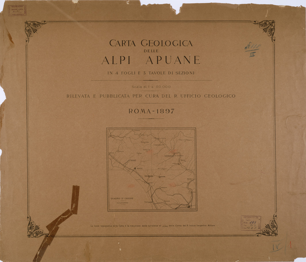 CARTA GEOLOGICA DELLE ALPI APUANE IN 4 FOGLI E 3 TAVOLE DI SEZIONI - SEZIONI GEOLOGICHE -Titolo - Quadro d'Unione