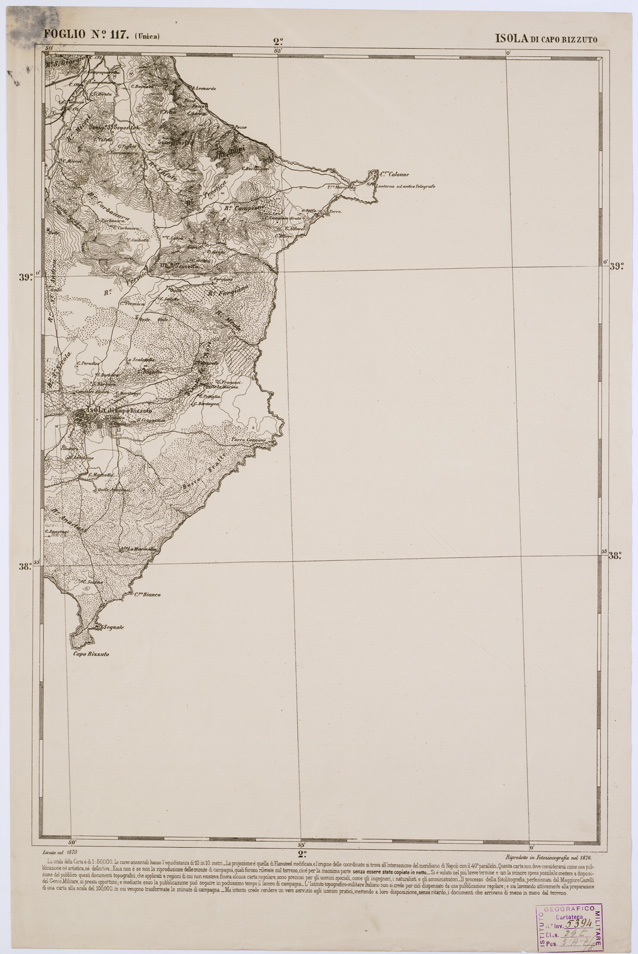 "...EDITA DALL'ISTITUTO TOPOGRAFICO MILITARE ITALIANO. La scala della carta è di 1:50.000. Le curve orizzontali hanno l'equidistanza di 10 in 10 metri. La proiezione è quella di Flamsteed modificata, e l'origine delle coordinate si trova all'intersezione del meridiano di Napoli con il 40° parallelo. Questa carta non deve considerarsi come una pubblicazione ne artistica ne definitiva. Essa non è se non la riproduzione delle minute di campagna quali furono rilevate sul terreno, cioè per la massima parte senza essere state copiate in netto. Si è voluto nel più breve termine e con la minore spesa possibile mettere a disposizione del pubblico questi documenti topografici, che applicati a regioni di cui non esisteva finora alcuna carta regolare sono preziosi per gli uomini speciali, come gli ingegneri, i naturalisti e gli amministratori. Il processo della fotolitografia, perfezionato dal Maggiore Castelli del Genio Militare, si presta opportuno e mediante esso la pubblicazione può seguire in pochissimo tempo il lavoro di campagna. L'Istituto topografico-militare Italiano non si crede perciò dispensato da una pubblicazione regolare e sta lavorando attivamente alla preparazione di una carta alla scala del 100.000 in cui vengonotrasformate le minute di campagna. Ma intanto crede rendere un vero servizio agli uomini pratici, mettendo a loro disposizione, senza ritardo, i documenti che arrivano di mano in mano dal terreno."