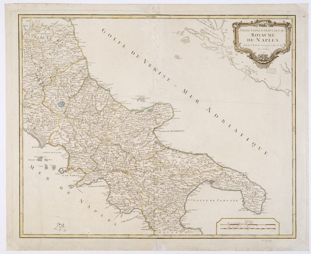 "...PAR LE S.R ROBERT GEOGRAPHE ORDIN. DU ROY AVEC PRIV. 1750. Nel catalogo Ragionato questa carta è descritta insieme ad un altra che ha come numero di inventario il 3441, ed ha anche a quanto sembra caratteristiche simili. Queste due carte sono così menzionate (pagina 406) : " Due fogli tratti da incisione su rame, stampati in nero, con confini politici e amministrativi a colori. Orografia dimostrata a monticelli. Abitati distinti con circolini e altri segni convenzionali dei quali non è data leggenda esplicativa. Sono indicate le zone boschive. Non è tracciata la rete stradale. Scale grafiche in miglia geografiche e in leghe di un'ora di marcia. Longitudini calcolate dal meridiano dell'isola del Ferro."