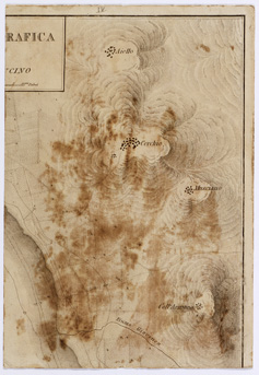 "Due fogli incisi su rame alle scale rispettive di 1:40.000 e 1 :13.000 circa, montati su tela a stacchi e contenuti in busta. Dimensioni m. 0,41x0,58 per ciascun foglio. Disegno di N. de Luca e incisione di T. Lomastro. Orografia rappresentata col tratteggio. Ciascun foglio è composto da 8 tavole."