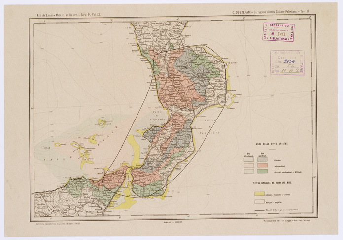 "...G. DE STEFANI I.G.M. (STAMPA 1912). Quattro tavole a colori annesse alle Mem. cl. sc. fis. Serie V, vol IX degli Atti dei Lincei. In basso a destra la leggenda dei segni e dei colori convenzionali."