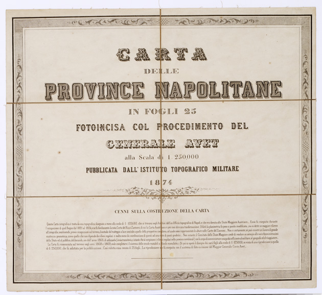 "... ALLA SCALA DI 1:250.000 PUBBLICATA DALL'ISTITUTO TOPOGRAFICO MILITARE, 1874. Bella, pregevolissima carta. E' in 25 fogli oltre il foglio titolo. Su di questo sono dati i seguenti "Cenni sulla costruzione della Carta": "Questa carta corografica è tratta da una topografica disegnata a mano alla scala di 1:103.680, che si trovava negli archivi dell'ex-Ufficio Topografico di Napoli e che era dovuta allo Stato Maggiore Austriaco. Essa fu eseguita durante l'occupazione di quel Regno dal 1821 al 1824, e ne fu fondamento la nota carta del Rizzi-Zannoni, di cui la Carta Austriaca è per così dire una trasformazione. Difatti la planimetria fu poco o punto modificata ma si dette maggior rilievo all'orografia, sostituendo, previe ricognizioni sul terreno, il metodo del tratteggio a luce zenitale, a quello della prospettiva cavaliera col quale sono rappesentate le alture nelle Carte del Zannoni. Non è certamente, nè può essere un lavoro di grande esattezza geometrica, come quello che non dipende da rilievi regolari e molto meno da coordinazione di questi ad una rete di punti geodetici. Nonostante il Comitato dello Stato Maggiore credè di rendere un servizio alle varie Amministrazioni dello Stato ed al pubblico, deliberando, sin dall'anno 1868, di utilizzarla (in via transitoria e intanto che si compivano i rilievi regolari nelle provincie meridionali) con lo scopo di somministrare una guida sufficiente al militare, al geografo ed al viaggiatore. La carta fu riconosciuta sul terreno negli anni 1868-1869 onde completarvi il sistema delle strade ruotabili a fondo manufatto. Di poi si operò il disegno dei vari fogli alla scala 1:250.000, che fu adottata per la pubblicazione. Così ridotta essa consta di 25 fogli. La riproduzione ne fu eseguita con il sistema di fotoincisione del Maggior Generale Conte Avet". (vedi: N. 39 d'Ordine, Cart. d'Arch. N° 71 - Docum. N° 9021 - Files A0001415-1491, e N. 61 d' Ordine, Cart. d 'Arch. N° 72 Docum. N° 9022 - Files A0001537-1594). Alla carta è unito un quadro di unione. Due copie, una delle quali incompleta e l'altra, completa, riveduta dal 1882-1884. La carta completa si trova in biblioteca è montata su tela a stacchi n. di inventario generale 50, schedario carte generali Italia. In archivio (Cart. d'Arch. N. 90 - Docum. n. 26 - Files A0002825-2844) si trova la copia parziale delle carte (mancano i seguenti fogli: 9, 13, 15, 16, 17, 20, 25) non è montata su tela."