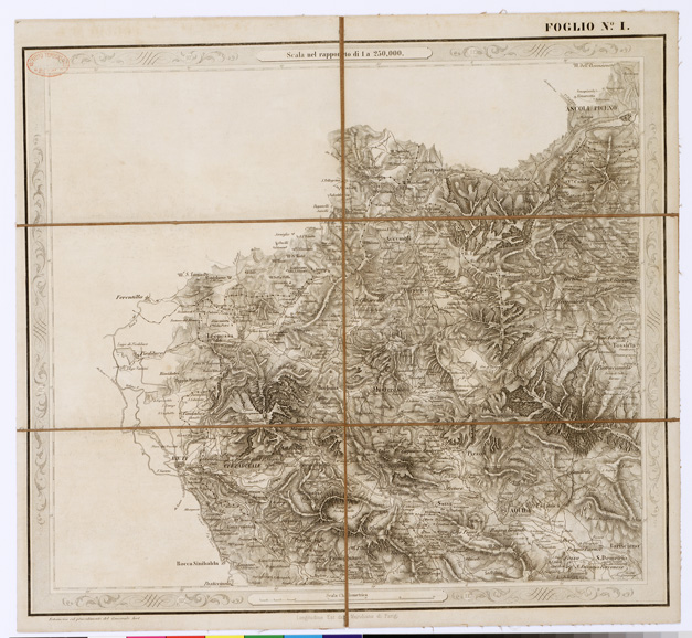 "... ALLA SCALA DI 1:250.000 PUBBLICATA DALL'ISTITUTO TOPOGRAFICO MILITARE, 1874. Bella, pregevolissima carta. E' in 25 fogli oltre il foglio titolo. Su di questo sono dati i seguenti "Cenni sulla costruzione della Carta": "Questa carta corografica è tratta da una topografica disegnata a mano alla scala di 1:103.680, che si trovava negli archivi dell'ex-Ufficio Topografico di Napoli e che era dovuta allo Stato Maggiore Austriaco. Essa fu eseguita durante l'occupazione di quel Regno dal 1821 al 1824, e ne fu fondamento la nota carta del Rizzi-Zannoni, di cui la Carta Austriaca è per così dire una trasformazione. Difatti la planimetria fu poco o punto modificata ma si dette maggior rilievo all'orografia, sostituendo, previe ricognizioni sul terreno, il metodo del tratteggio a luce zenitale, a quello della prospettiva cavaliera col quale sono rappesentate le alture nelle Carte del Zannoni. Non è certamente, nè può essere un lavoro di grande esattezza geometrica, come quello che non dipende da rilievi regolari e molto meno da coordinazione di questi ad una rete di punti geodetici. Nonostante il Comitato dello Stato Maggiore credè di rendere un servizio alle varie Amministrazioni dello Stato ed al pubblico, deliberando, sin dall'anno 1868, di utilizzarla (in via transitoria e intanto che si compivano i rilievi regolari nelle provincie meridionali) con lo scopo di somministrare una guida sufficiente al militare, al geografo ed al viaggiatore. La carta fu riconosciuta sul terreno negli anni 1868-1869 onde completarvi il sistema delle strade ruotabili a fondo manufatto. Di poi si operò il disegno dei vari fogli alla scala 1:250.000, che fu adottata per la pubblicazione. Così ridotta essa consta di 25 fogli. La riproduzione ne fu eseguita con il sistema di fotoincisione del Maggior Generale Conte Avet". (vedi: N. 39 d'Ordine, Cart. d'Arch. N° 71 - Docum. N° 9021 - Files A0001415-1491, e N. 61 d' Ordine, Cart. d 'Arch. N° 72 Docum. N° 9022 - Files A0001537-1594). Alla carta è unito un quadro di unione. Due copie, una delle quali incompleta e l'altra, completa, riveduta dal 1882-1884. La carta completa si trova in biblioteca è montata su tela a stacchi n. di inventario generale 50, schedario carte generali Italia. In archivio (Cart. d'Arch. N. 90 - Docum. n. 26 - Files A0002825-2844) si trova la copia parziale delle carte (mancano i seguenti fogli: 9, 13, 15, 16, 17, 20, 25) non è montata su tela."