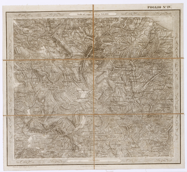 "...FOGLI 25 FOTOINCISA COL PROCEDIMENTO DEL GENERALE AVET ALLA SCALA DI 1:250.000 PUBBLICATA DALL'ISTITUTO TOPOGRAFICO MILITARE, 1874. Bella, pregevolissima carta. E' in 25 fogli oltre il foglio titolo. Su di questo sono dati i seguenti "Cenni sulla costruzione della Carta": "Questa carta corografica è tratta da una topografica disegnata a mano alla scala di 1:103.680, che si trovava negli archivi dell'ex-Ufficio Topografico di Napoli e che era dovuta allo Stato Maggiore Austriaco. Essa fu eseguita durante l'occupazione di quel Regno dal 1821 al 1824, e ne fu fondamento la nota carta del Rizzi-Zannoni, di cui la Carta Austriaca è per così dire una trasformazione. Difatti la planimetria fu poco o punto modificata ma si dette maggior rilievo all'orografia, sostituendo, previe ricognizioni sul terreno, il metodo del tratteggio a luce zenitale, a quello della prospettiva cavaliera col quale sono rappesentate le alture nelle Carte del Zannoni. Non è certamente, nè può essere un lavoro di grande esattezza geometrica, come quello che non dipende da rilievi regolari e molto meno da coordinazione di questi ad una rete di punti geodetici. Nonostante il Comitato dello Stato Maggiore credè di rendere un servizio alle varie Amministrazioni dello Stato ed al pubblico, deliberando, sin dall'anno 1868, di utilizzarla (in via transitoria e intanto che si compivano i rilievi regolari nelle provincie meridionali) con lo scopo di somministrare una guida sufficiente al militare, al geografo ed al viaggiatore. La carta fu riconosciuta sul terreno negli anni 1868-1869 onde completarvi il sistema delle strade ruotabili a fondo manufatto. Di poi si operò il disegno dei vari fogli alla scala 1:250.000, che fu adottata per la pubblicazione. Così ridotta essa consta di 25 fogli. La riproduzione ne fu eseguita con il sistema di fotoincisione del Maggior Generale Conte Avet". (vedi: N. 39 d'Ordine, Cart. d'Arch. N° 71 - Docum. N° 9021 - Files A0001415-1491, e N. 61 d' Ordine, Cart. d 'Arch. N° 72 Docum. N° 9022 - Files A0001537-1594). Alla carta è unito un quadro di unione. Due copie, una delle quali incompleta e l'altra, completa, riveduta dal 1882-1884. La carta completa si trova in biblioteca è montata su tela a stacchi n. di inventario generale 50, schedario carte generali Italia. In archivio (Cart. d'Arch. N. 90 - Docum. n. 26 - Files A0002825-2844) si trova la copia parziale delle carte (mancano i seguenti fogli: 9, 13, 15, 16, 17, 20, 25) non è montata su tela."