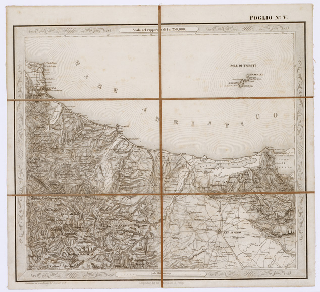 "...FOGLI 25 FOTOINCISA COL PROCEDIMENTO DEL GENERALE AVET ALLA SCALA DI 1:250.000 PUBBLICATA DALL'ISTITUTO TOPOGRAFICO MILITARE, 1874. Bella, pregevolissima carta. E' in 25 fogli oltre il foglio titolo. Su di questo sono dati i seguenti "Cenni sulla costruzione della Carta": "Questa carta corografica è tratta da una topografica disegnata a mano alla scala di 1:103.680, che si trovava negli archivi dell'ex-Ufficio Topografico di Napoli e che era dovuta allo Stato Maggiore Austriaco. Essa fu eseguita durante l'occupazione di quel Regno dal 1821 al 1824, e ne fu fondamento la nota carta del Rizzi-Zannoni, di cui la Carta Austriaca è per così dire una trasformazione. Difatti la planimetria fu poco o punto modificata ma si dette maggior rilievo all'orografia, sostituendo, previe ricognizioni sul terreno, il metodo del tratteggio a luce zenitale, a quello della prospettiva cavaliera col quale sono rappesentate le alture nelle Carte del Zannoni. Non è certamente, nè può essere un lavoro di grande esattezza geometrica, come quello che non dipende da rilievi regolari e molto meno da coordinazione di questi ad una rete di punti geodetici. Nonostante il Comitato dello Stato Maggiore credè di rendere un servizio alle varie Amministrazioni dello Stato ed al pubblico, deliberando, sin dall'anno 1868, di utilizzarla (in via transitoria e intanto che si compivano i rilievi regolari nelle provincie meridionali) con lo scopo di somministrare una guida sufficiente al militare, al geografo ed al viaggiatore. La carta fu riconosciuta sul terreno negli anni 1868-1869 onde completarvi il sistema delle strade ruotabili a fondo manufatto. Di poi si operò il disegno dei vari fogli alla scala 1:250.000, che fu adottata per la pubblicazione. Così ridotta essa consta di 25 fogli. La riproduzione ne fu eseguita con il sistema di fotoincisione del Maggior Generale Conte Avet". (vedi: N. 39 d'Ordine, Cart. d'Arch. N° 71 - Docum. N° 9021 - Files A0001415-1491, e N. 61 d' Ordine, Cart. d 'Arch. N° 72 Docum. N° 9022 - Files A0001537-1594). Alla carta è unito un quadro di unione. Due copie, una delle quali incompleta e l'altra, completa, riveduta dal 1882-1884. La carta completa si trova in biblioteca è montata su tela a stacchi n. di inventario generale 50, schedario carte generali Italia. In archivio (Cart. d'Arch. N. 90 - Docum. n. 26 - Files A0002825-2844) si trova la copia parziale delle carte (mancano i seguenti fogli: 9, 13, 15, 16, 17, 20, 25) non è montata su tela."