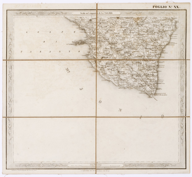 "...FOGLI 25 FOTOINCISA COL PROCEDIMENTO DEL GENERALE AVET ALLA SCALA DI 1:250.000 PUBBLICATA DALL'ISTITUTO TOPOGRAFICO MILITARE, 1874. Bella, pregevolissima carta. E' in 25 fogli oltre il foglio titolo. Su di questo sono dati i seguenti "Cenni sulla costruzione della Carta": "Questa carta corografica è tratta da una topografica disegnata a mano alla scala di 1:103.680, che si trovava negli archivi dell'ex-Ufficio Topografico di Napoli e che era dovuta allo Stato Maggiore Austriaco. Essa fu eseguita durante l'occupazione di quel Regno dal 1821 al 1824, e ne fu fondamento la nota carta del Rizzi-Zannoni, di cui la Carta Austriaca è per così dire una trasformazione. Difatti la planimetria fu poco o punto modificata ma si dette maggior rilievo all'orografia, sostituendo, previe ricognizioni sul terreno, il metodo del tratteggio a luce zenitale, a quello della prospettiva cavaliera col quale sono rappesentate le alture nelle Carte del Zannoni. Non è certamente, nè può essere un lavoro di grande esattezza geometrica, come quello che non dipende da rilievi regolari e molto meno da coordinazione di questi ad una rete di punti geodetici. Nonostante il Comitato dello Stato Maggiore credè di rendere un servizio alle varie Amministrazioni dello Stato ed al pubblico, deliberando, sin dall'anno 1868, di utilizzarla (in via transitoria e intanto che si compivano i rilievi regolari nelle provincie meridionali) con lo scopo di somministrare una guida sufficiente al militare, al geografo ed al viaggiatore. La carta fu riconosciuta sul terreno negli anni 1868-1869 onde completarvi il sistema delle strade ruotabili a fondo manufatto. Di poi si operò il disegno dei vari fogli alla scala 1:250.000, che fu adottata per la pubblicazione. Così ridotta essa consta di 25 fogli. La riproduzione ne fu eseguita con il sistema di fotoincisione del Maggior Generale Conte Avet". (vedi: N. 39 d'Ordine, Cart. d'Arch. N° 71 - Docum. N° 9021 - Files A0001415-1491, e N. 61 d' Ordine, Cart. d 'Arch. N° 72 Docum. N° 9022 - Files A0001537-1594). Alla carta è unito un quadro di unione. Due copie, una delle quali incompleta e l'altra, completa, riveduta dal 1882-1884. La carta completa si trova in biblioteca è montata su tela a stacchi n. di inventario generale 50, schedario carte generali Italia. In archivio (Cart. d'Arch. N. 90 - Docum. n. 26 - Files A0002825-2844) si trova la copia parziale delle carte (mancano i seguenti fogli: 9, 13, 15, 16, 17, 20, 25) non è montata su tela."
