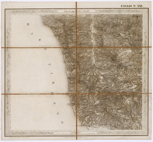 "...FOGLI 25 FOTOINCISA COL PROCEDIMENTO DEL GENERALE AVET ALLA SCALA DI 1:250.000 PUBBLICATA DALL'ISTITUTO TOPOGRAFICO MILITARE, 1874. Bella, pregevolissima carta. E' in 25 fogli oltre il foglio titolo. Su di questo sono dati i seguenti "Cenni sulla costruzione della Carta": "Questa carta corografica è tratta da una topografica disegnata a mano alla scala di 1:103.680, che si trovava negli archivi dell'ex-Ufficio Topografico di Napoli e che era dovuta allo Stato Maggiore Austriaco. Essa fu eseguita durante l'occupazione di quel Regno dal 1821 al 1824, e ne fu fondamento la nota carta del Rizzi-Zannoni, di cui la Carta Austriaca è per così dire una trasformazione. Difatti la planimetria fu poco o punto modificata ma si dette maggior rilievo all'orografia, sostituendo, previe ricognizioni sul terreno, il metodo del tratteggio a luce zenitale, a quello della prospettiva cavaliera col quale sono rappesentate le alture nelle Carte del Zannoni. Non è certamente, nè può essere un lavoro di grande esattezza geometrica, come quello che non dipende da rilievi regolari e molto meno da coordinazione di questi ad una rete di punti geodetici. Nonostante il Comitato dello Stato Maggiore credè di rendere un servizio alle varie Amministrazioni dello Stato ed al pubblico, deliberando, sin dall'anno 1868, di utilizzarla (in via transitoria e intanto che si compivano i rilievi regolari nelle provincie meridionali) con lo scopo di somministrare una guida sufficiente al militare, al geografo ed al viaggiatore. La carta fu riconosciuta sul terreno negli anni 1868-1869 onde completarvi il sistema delle strade ruotabili a fondo manufatto. Di poi si operò il disegno dei vari fogli alla scala 1:250.000, che fu adottata per la pubblicazione. Così ridotta essa consta di 25 fogli. La riproduzione ne fu eseguita con il sistema di fotoincisione del Maggior Generale Conte Avet". (vedi: N. 39 d'Ordine, Cart. d'Arch. N° 71 - Docum. N° 9021 - Files A0001415-1491, e N. 61 d' Ordine, Cart. d 'Arch. N° 72 Docum. N° 9022 - Files A0001537-1594). Alla carta è unito un quadro di unione. Due copie, una delle quali incompleta e l'altra, completa, riveduta dal 1882-1884. La carta completa si trova in biblioteca è montata su tela a stacchi n. di inventario generale 50, schedario carte generali Italia. In archivio (Cart. d'Arch. N. 90 - Docum. n. 26 - Files A0002825-2844) si trova la copia parziale delle carte (mancano i seguenti fogli: 9, 13, 15, 16, 17, 20, 25) non è montata su tela."