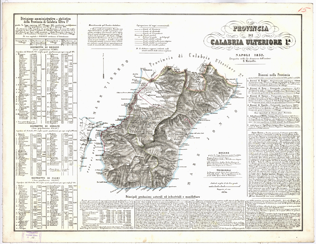 "...DIVISA IN SINGOLE PROVINCIE. Carta in ventitre fogli montati su tela, stampati a colori in litografia, eseguiti sotto la direzione dell'autore B. Marzolla. Annesso un foglio d'insieme per il Regno delle Due Sicilie alla scala di 1:2.500.000 circa, su cui trovasi scritto: "Atlante geografico di B. Marzolla pubblicandosi ora da L. Manzella, Napoli 1859, nello Stabilimento Geografico". Le carte distinguono a segni e colori i confini di stato, di provincia, di distretto, di circondario, di comune, le strade regie postali, rotabili, in costruzione, sentieri per cavalli e per pedoni, stazioni di posta, telegrafi. L'orografia è rappresentata col tratteggio a luce obliqua. Ciascun foglio contiene attorno al campo disegnato un quadro statistico-amministrativo, ed ampie notizie storiche e di geografia fisica ed economica: ognuno è distinto da un titolo particolare. Una carta analoga si trova alla Cart. d'Arch. n. 86 Docum. n. 11. "